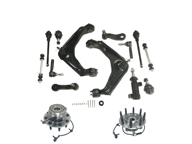 Product Remark: Includes (2) Front Wheel Hub and Bearing Assemblies, (2) Front Upper Control Arm and Ball Joint Assemblies, (2) Lower Ball Joints, (2) Front Sway Bar End Links, (2) Outer Tie Rod Ends, (2) Inner Tie Rod Ends, (1) Idler Arm, (1) Idler Arm Bracket Assembly, (1) 3-Groove Pitman Arm