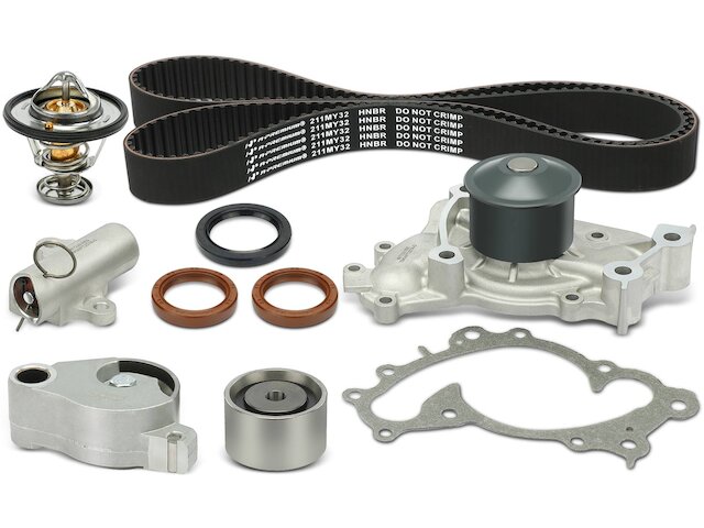 - Package Contents: 1x Timing Belt, 1x Timing Belt Tensioner, 1x Hydraulic Tensioner, 1x Timing Idler, 1x Water Pump with Gasket, 2x Camshaft Seals, 1x Crankshaft Seal, 1x Thermostat