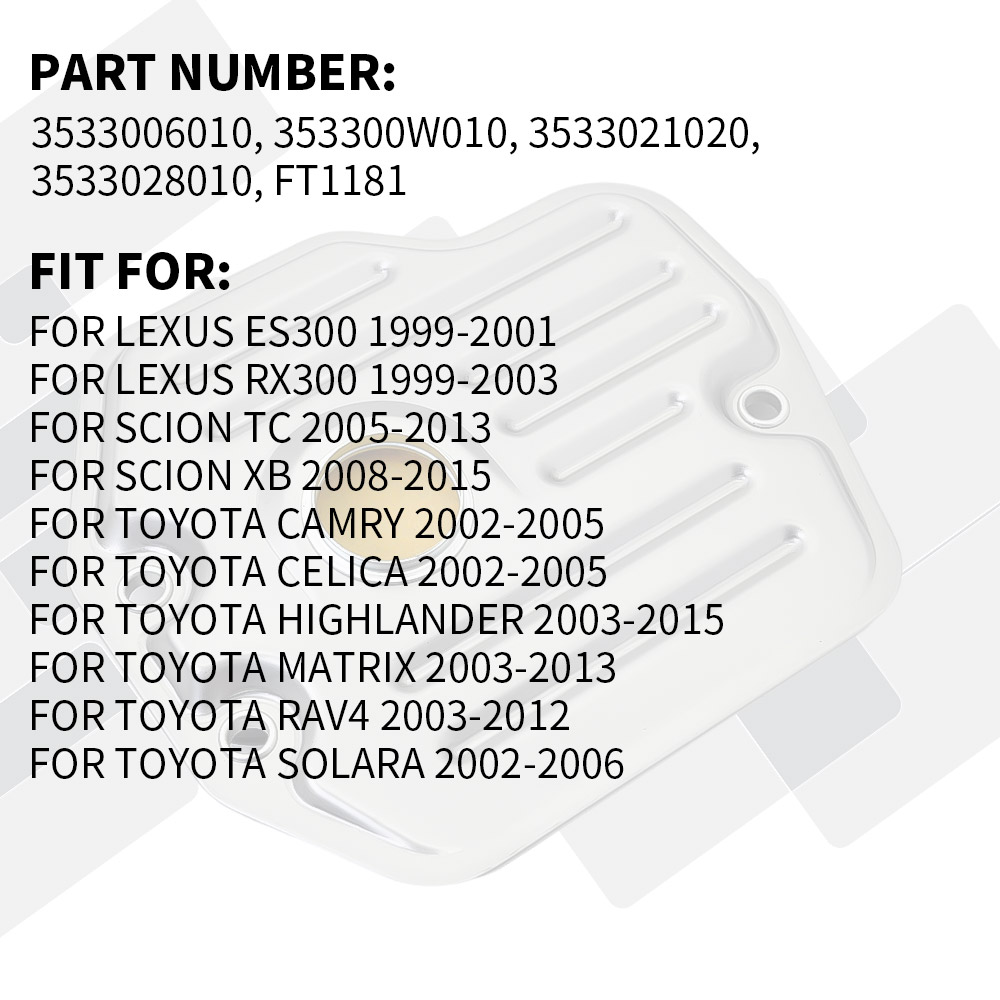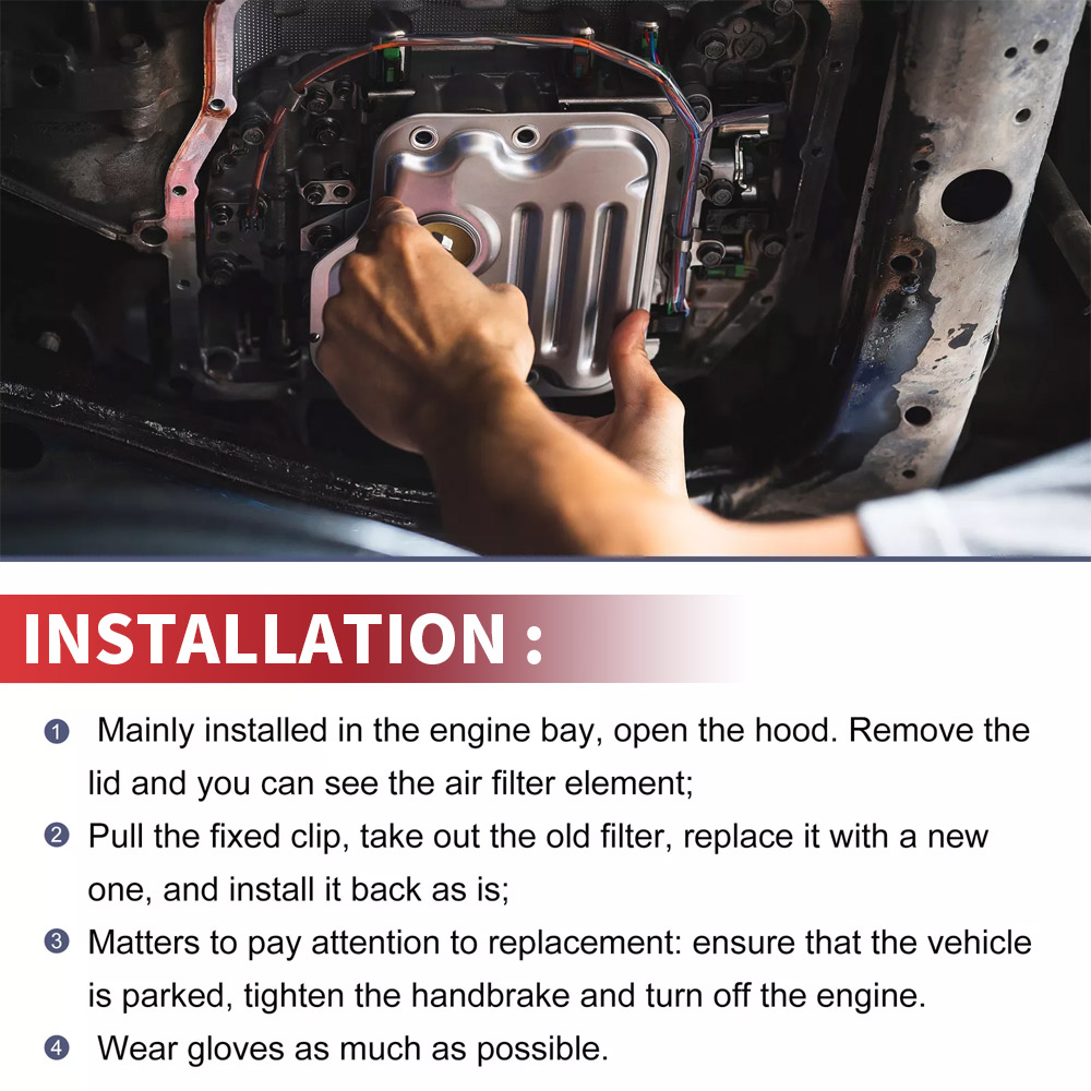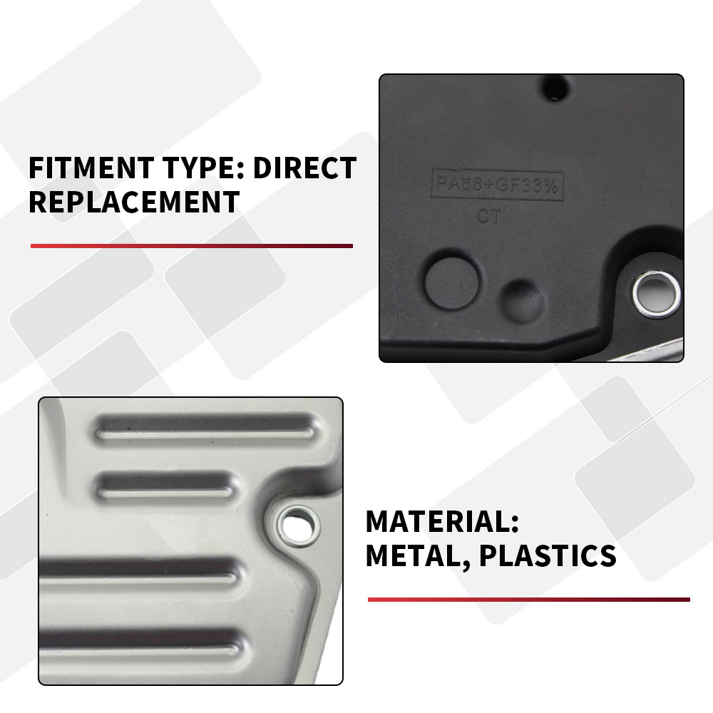 -Installation steps: remove the oil pan, take out the old filter and install a new filter, reseal the transmission with a gasket.