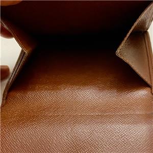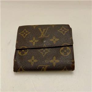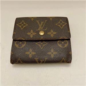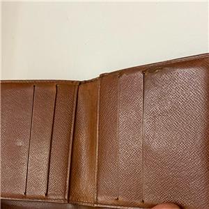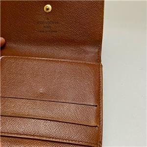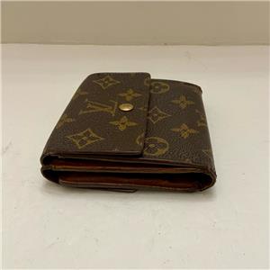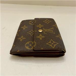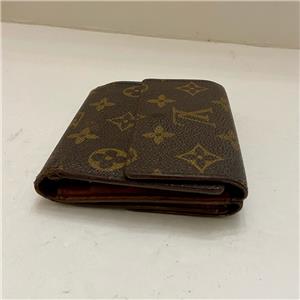 This is a rare, pre-owned tri-fold compact wallet made of brown monogrammed coated canvas. It has slots for paper bills, for credit cards and ID; pocket for coins and keys. Folded it measures about 4 inches long and 4 inches wide. It is in good condition as shown in photos. Date code shown TH0975 Made in France, July 1995.