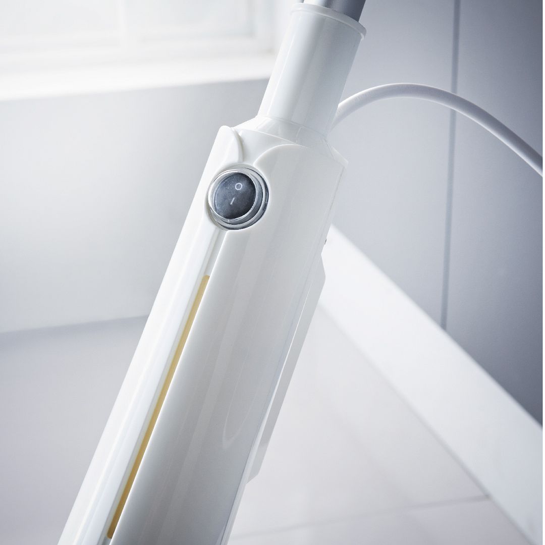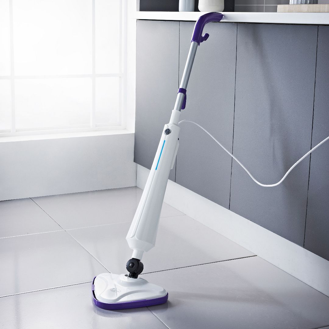 Fully clean and scrub all kinds of surfaces with this Lightweight Steam Mop! It is effective at cleaning hardwood floors, tiles, rugs, carpets and more with its chemical-free steaming process. The powerful 23g/min steam flow is combined with the microfibre mop heads to ensure any dirt or stains are swiftly removed. The mop head, with its triangular shape, is designed to be able to clean even the hardest to reach corners, as it swivels up to 180 degrees and features a flexible handle. The microfibres are also machine washable for convenience. Its tank has a capacity of 350ml, allowing for 15 minutes of continuous use, and its 1300W of power means it’ll be ready to steam in just 20 seconds. It features double colour working indicator lights, and an extra long 5 metre cord for accessible use, and with measurements of 48 x 13.5 x 25cm, it can easily be carried around the home for use in all rooms.