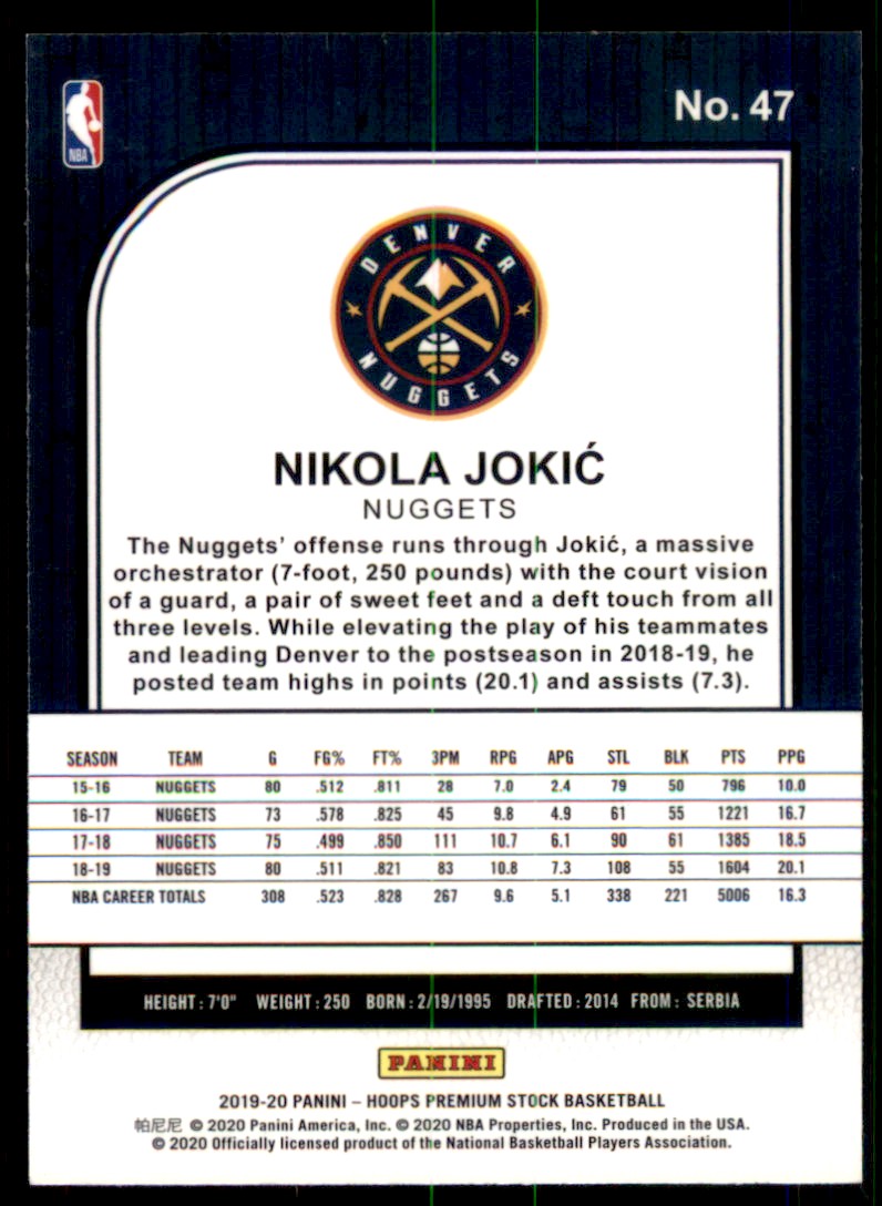 2019-20 NBA Hoops Premium Stock #47 Nikola Jokic Denver Nuggets