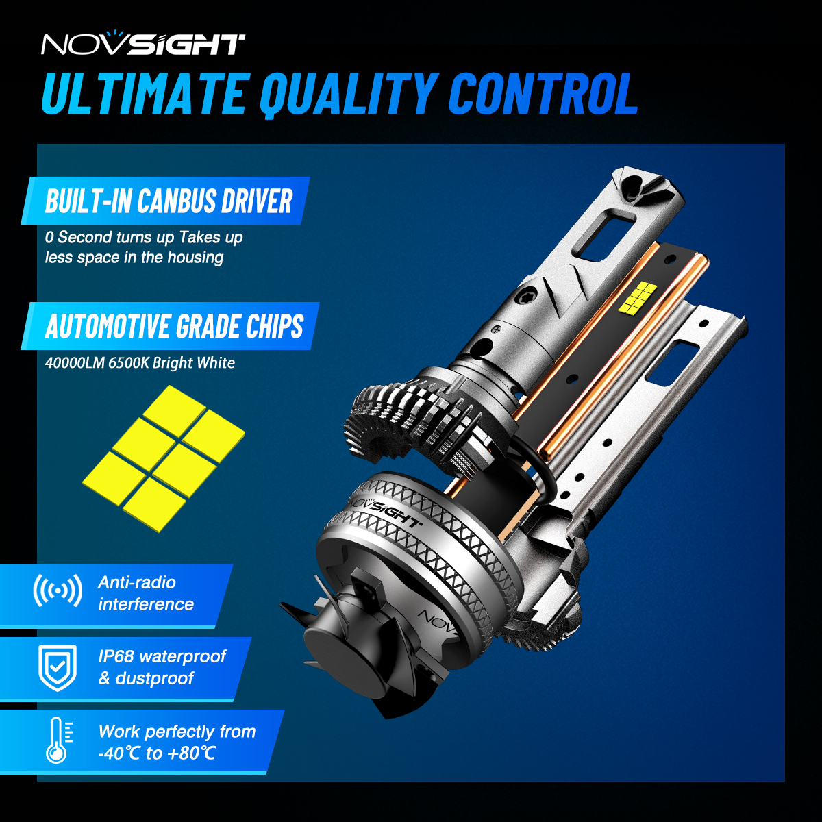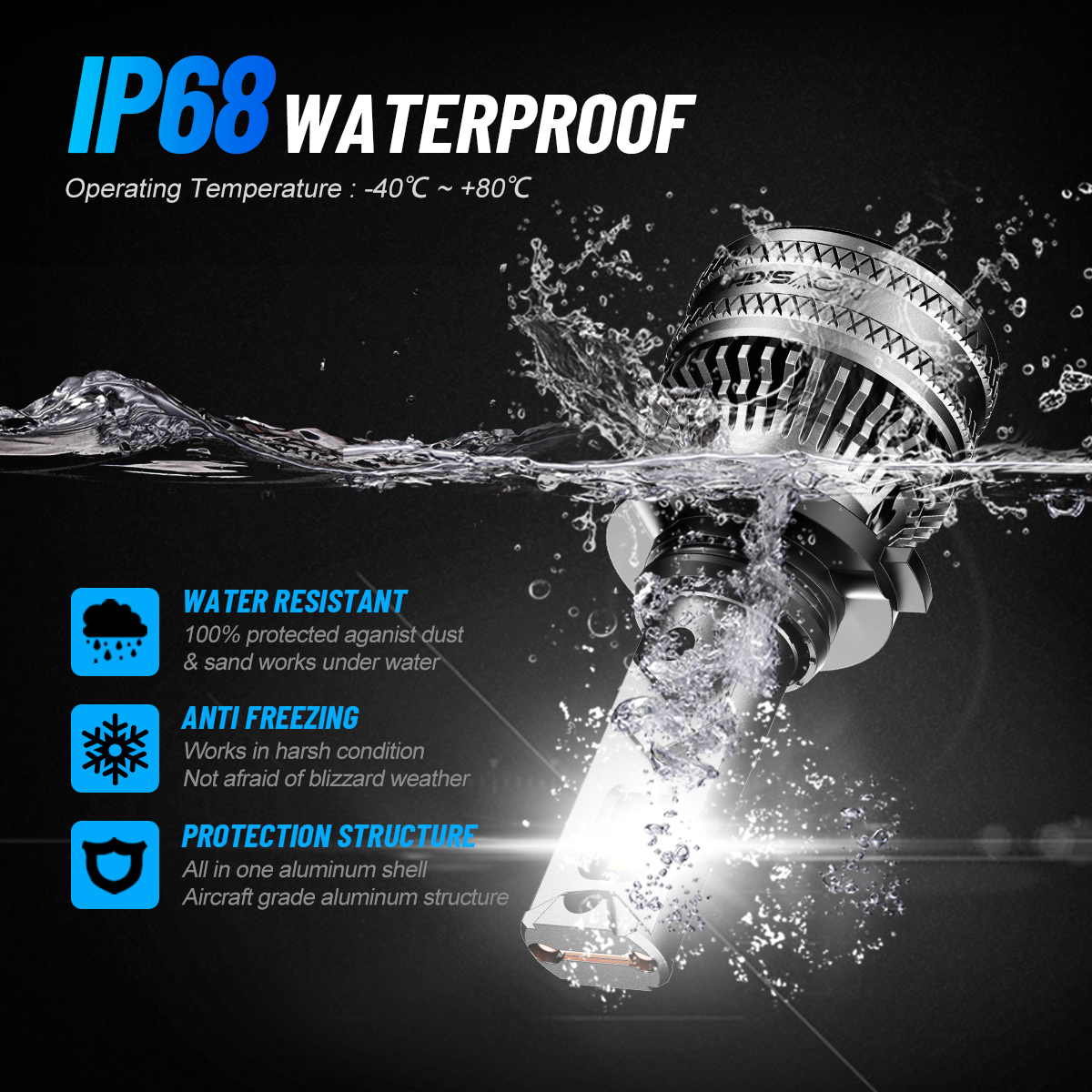 【Durable & Waterproof for All Weather Conditions】The NOVSIGHT Bulb is made from high quality materials and designed to cope with a wide range of harsh weather conditions. With an IP68 waterproof rating, they maintain excellent performance in rain, snow or extreme temperatures. Whether you're driving in rain or snow, these LED headlight bulbs ensure consistent performance and long-lasting durability.