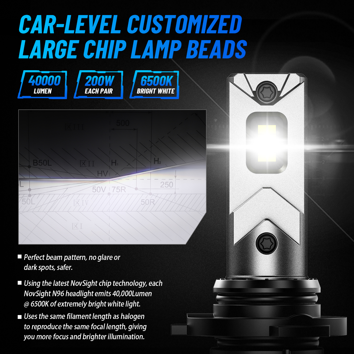 【Ultra Bright 40,000LM with 200W Power】The NOVSIGHT LED Headlight Bulb offers up to 40,000 lumens and a powerful 200W. Designed for drivers who need maximum visibility, this high performance Headlight Bulb ensures you can see clearly in the darkest conditions. The perfect beam tangent ensures no black spots, providing a wider, clearer range of illumination to enhance your driving safety.