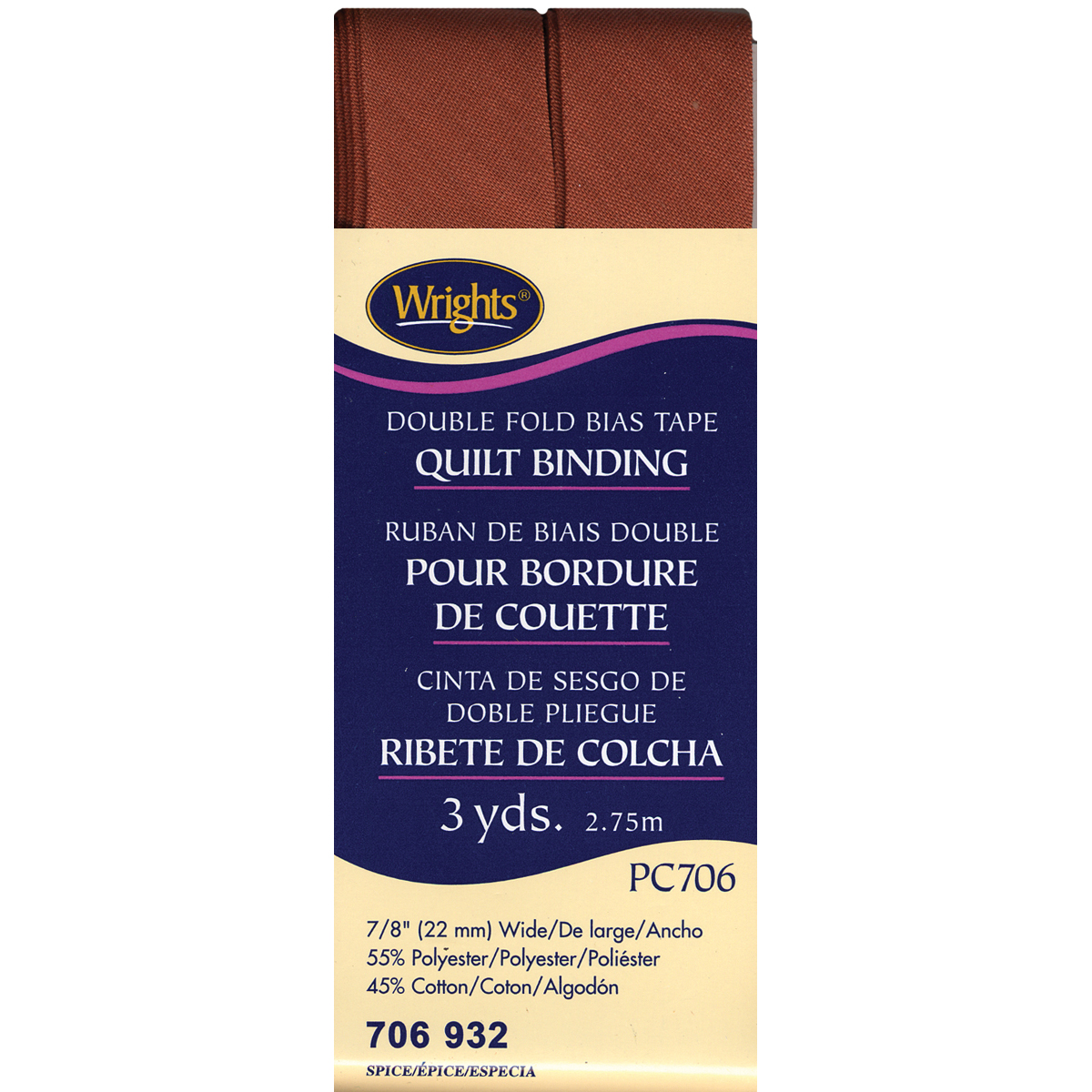 WRIGHTS-Double Fold Bias Tape. This size of bias tape is most commonly used for binding quilts but is perfect for all sorts of binding needs for wearables to home decor, accessories to toys. This package contains 3yd/2.75m of 7/8in bias tape made of 55% polyester/45% cotton. Imported.
