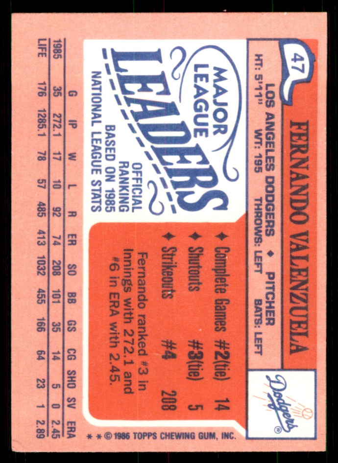 | 1986 Topps Major League Leaders Minis 47 Fernando Valenzuela. |