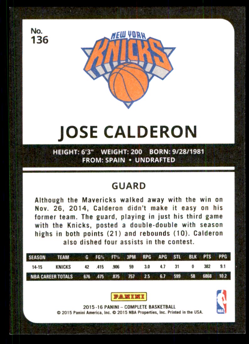 | Description: | Jose Calderon | | Category: | Basketball | | Year: | 2015 | | Product: | Panini Complete\ | | Team: | New York Knicks | | Card Number: | 136 | | Dimensions: | 3½" x 2½" |