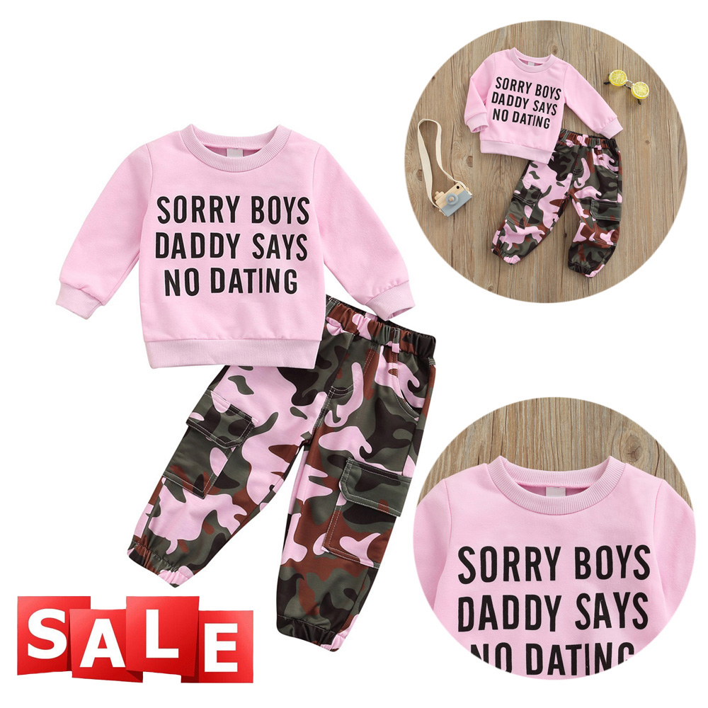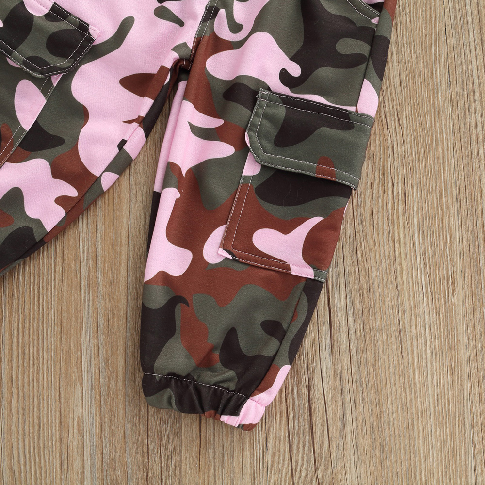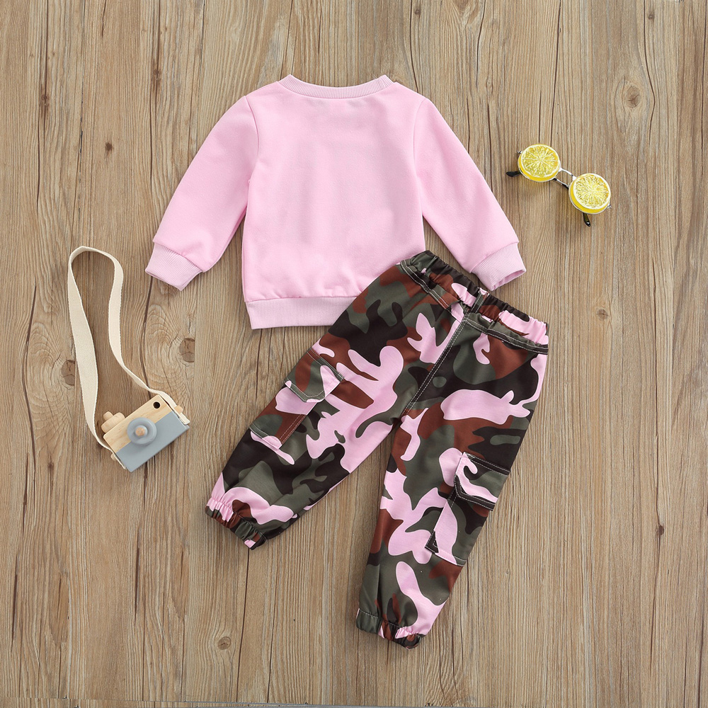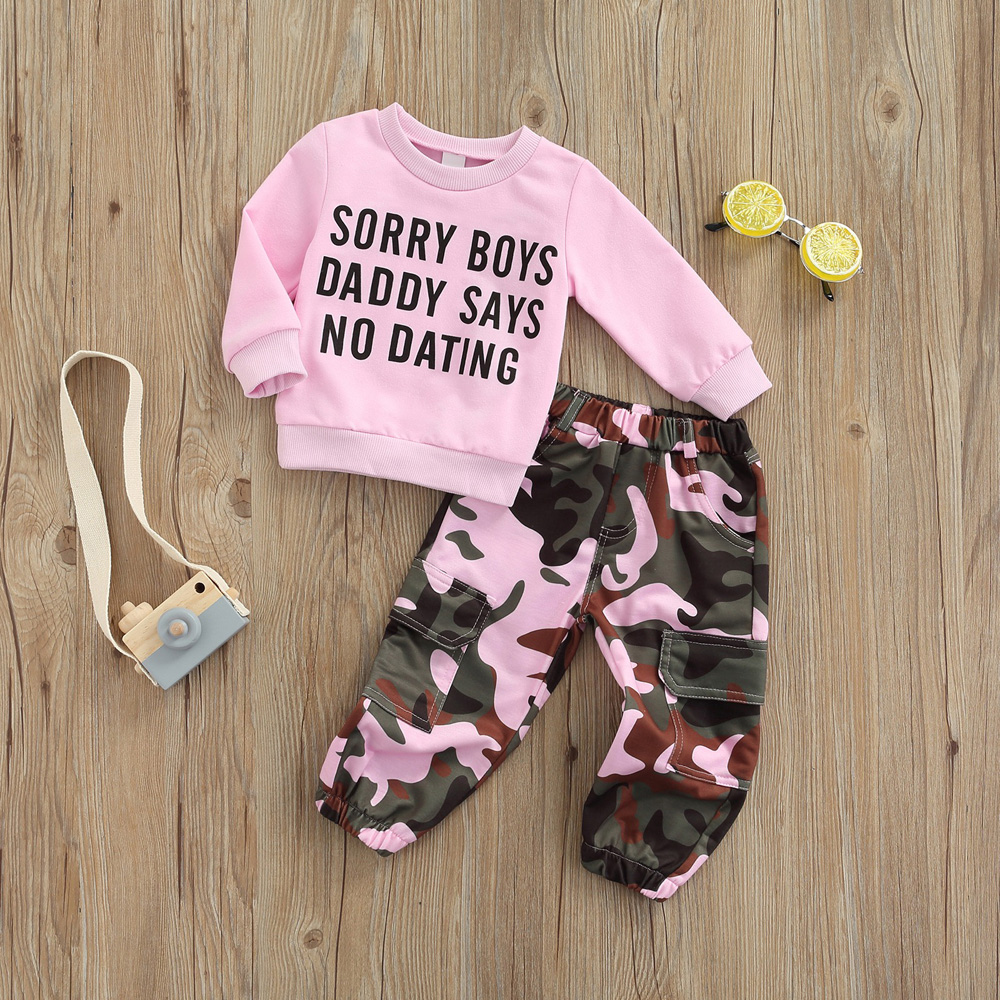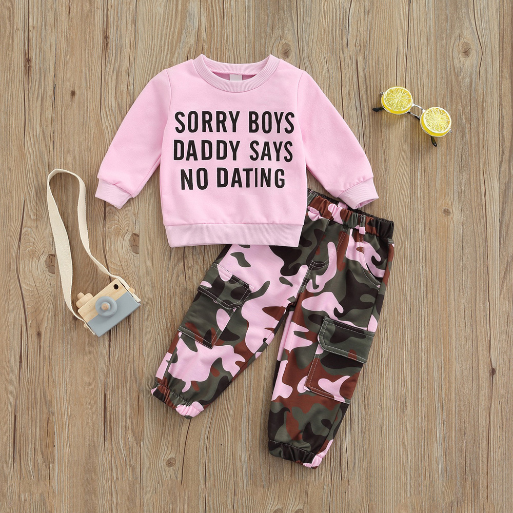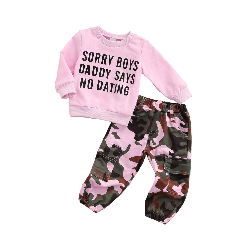 Collar: Round Neck Pattern: Letter & Camouflage Gender: Girls Item Type: Pants Sets Size chart: Attention plz: If your kid is chubby, we recomend choosing a larger size, thanks. (Measurements shown in the size chart refer to item measurements, not body)