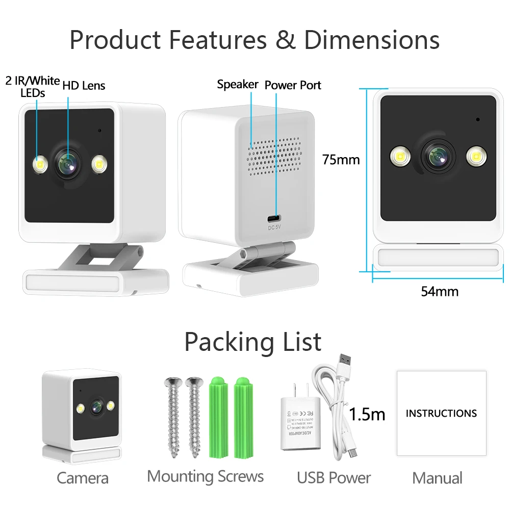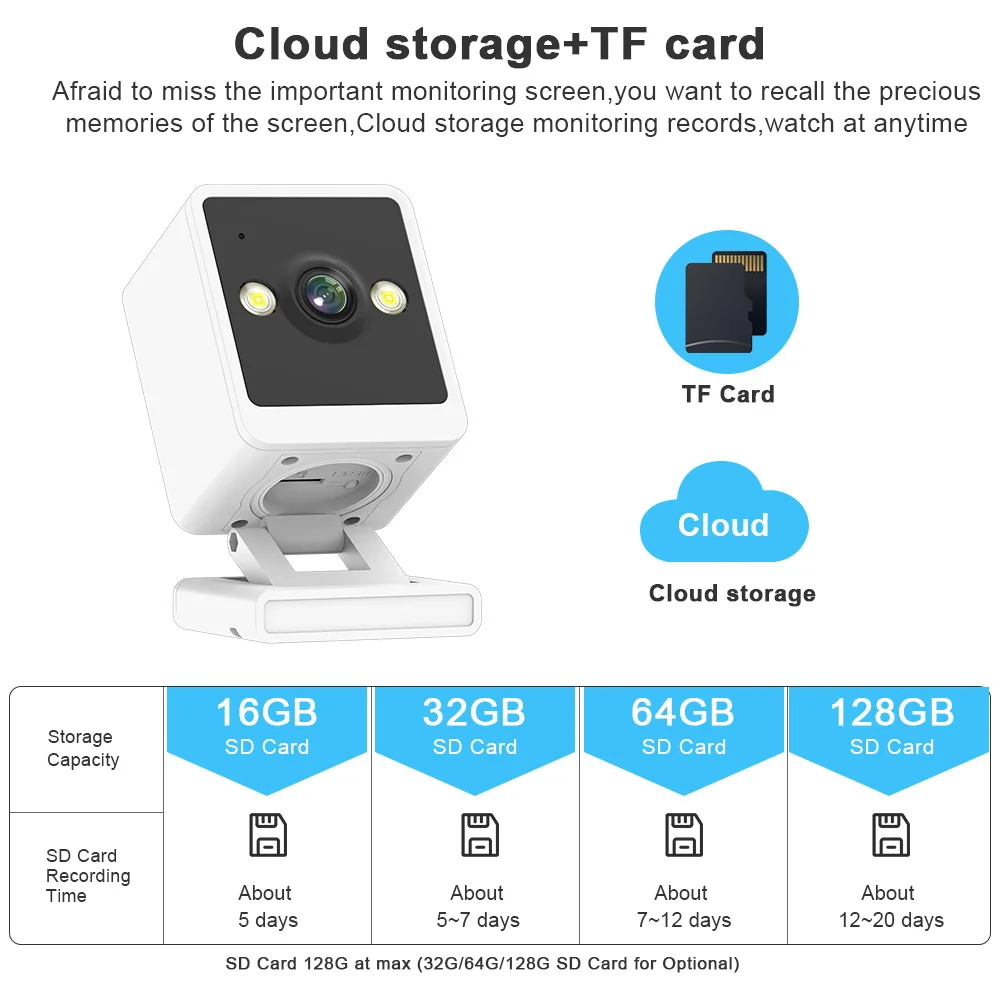 *Support cloud storage+TF local video recording (maximum 128GB) Recording file size ≈ 6G/day (all day video recording).
