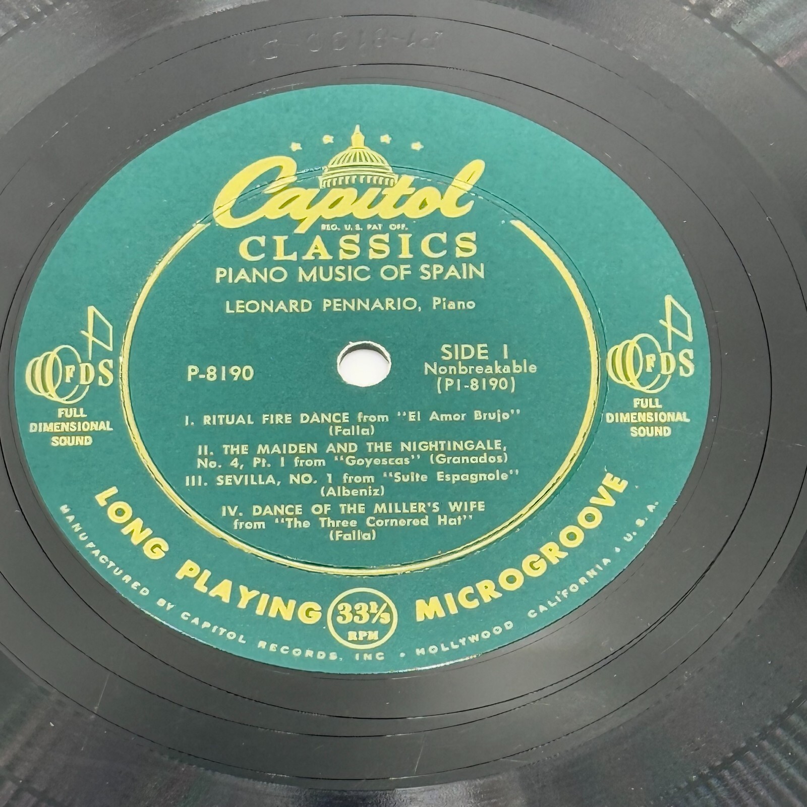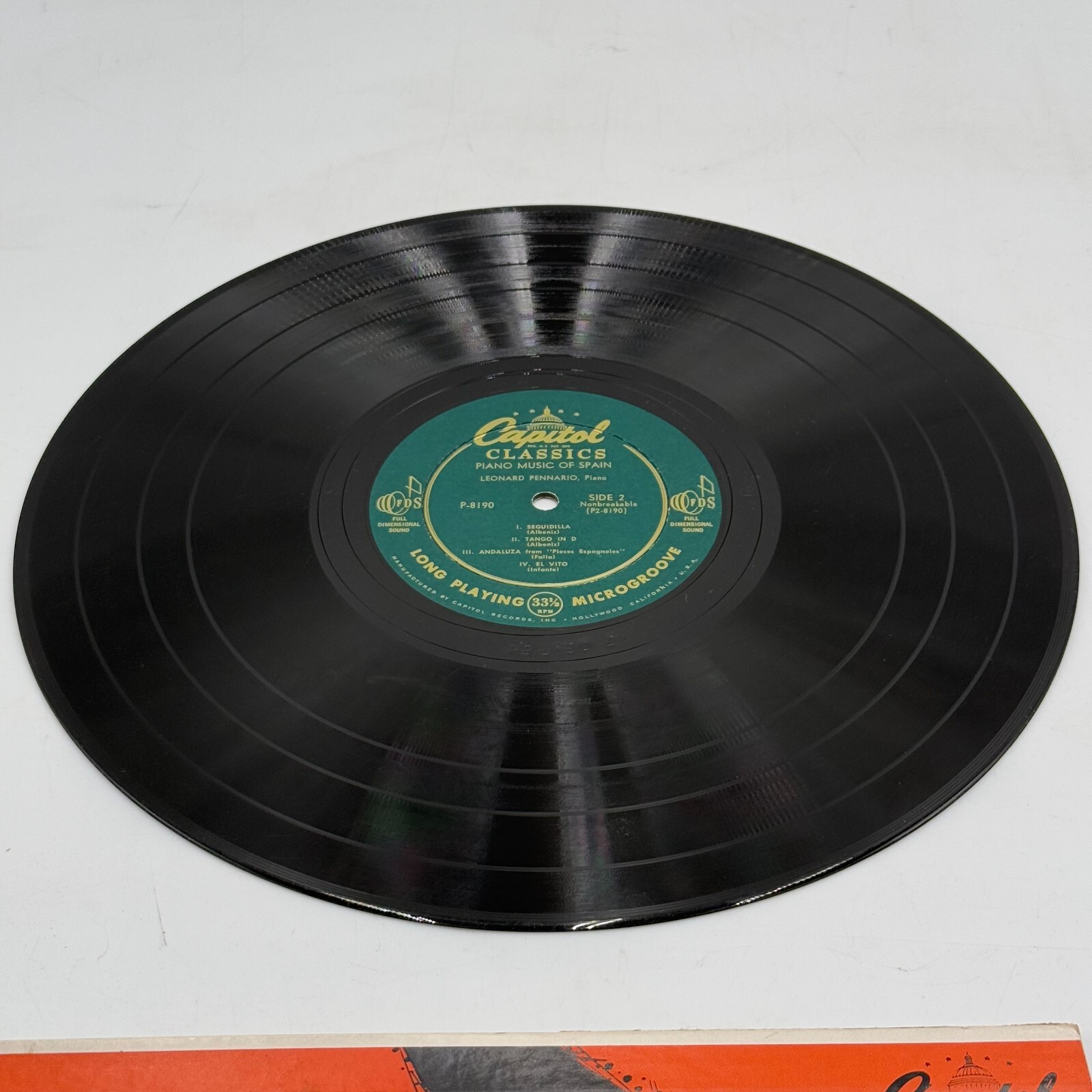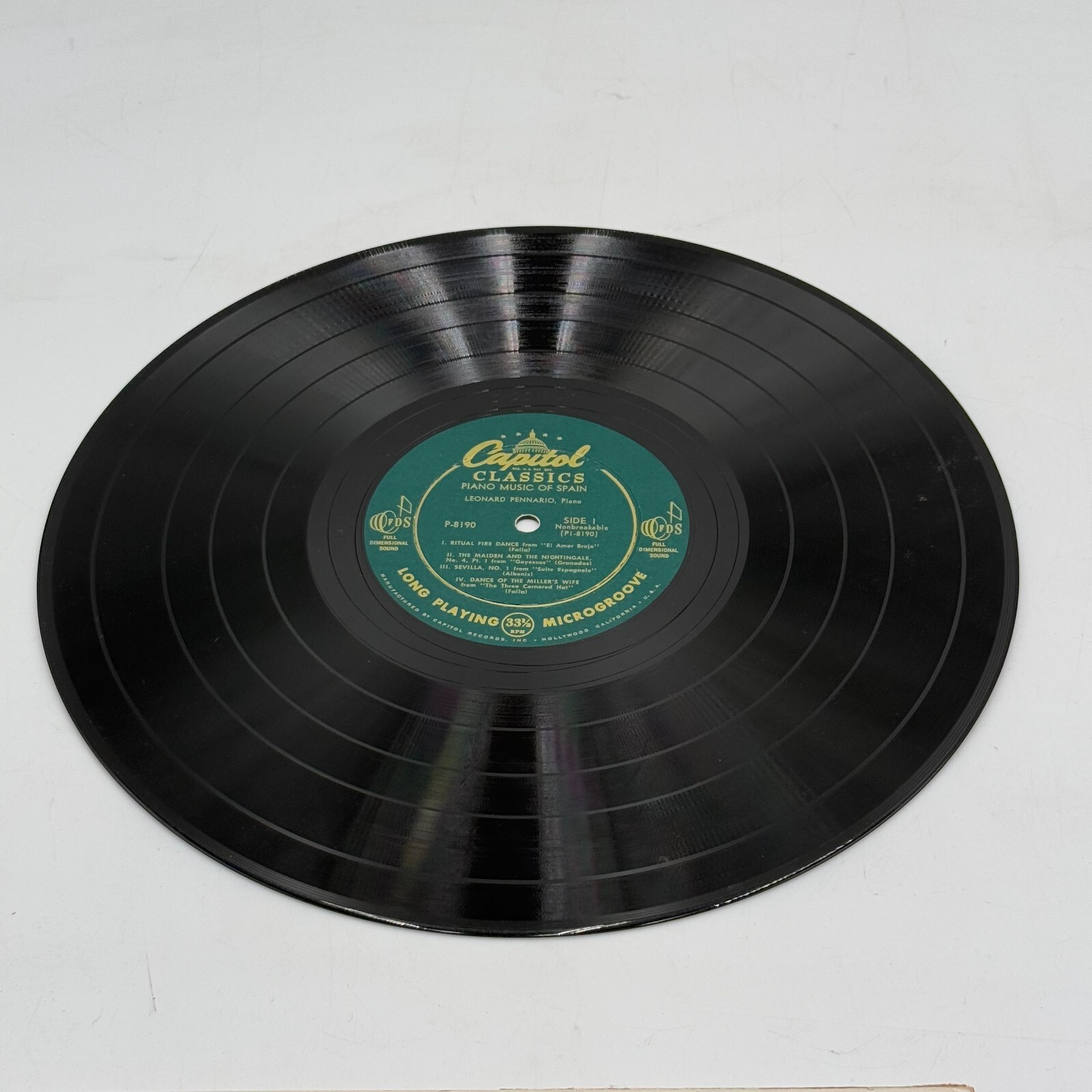 Experience the rich tapestry of Spanish piano music with Leonard Pennario's renditions, now available on a 12-inch mono vinyl record.