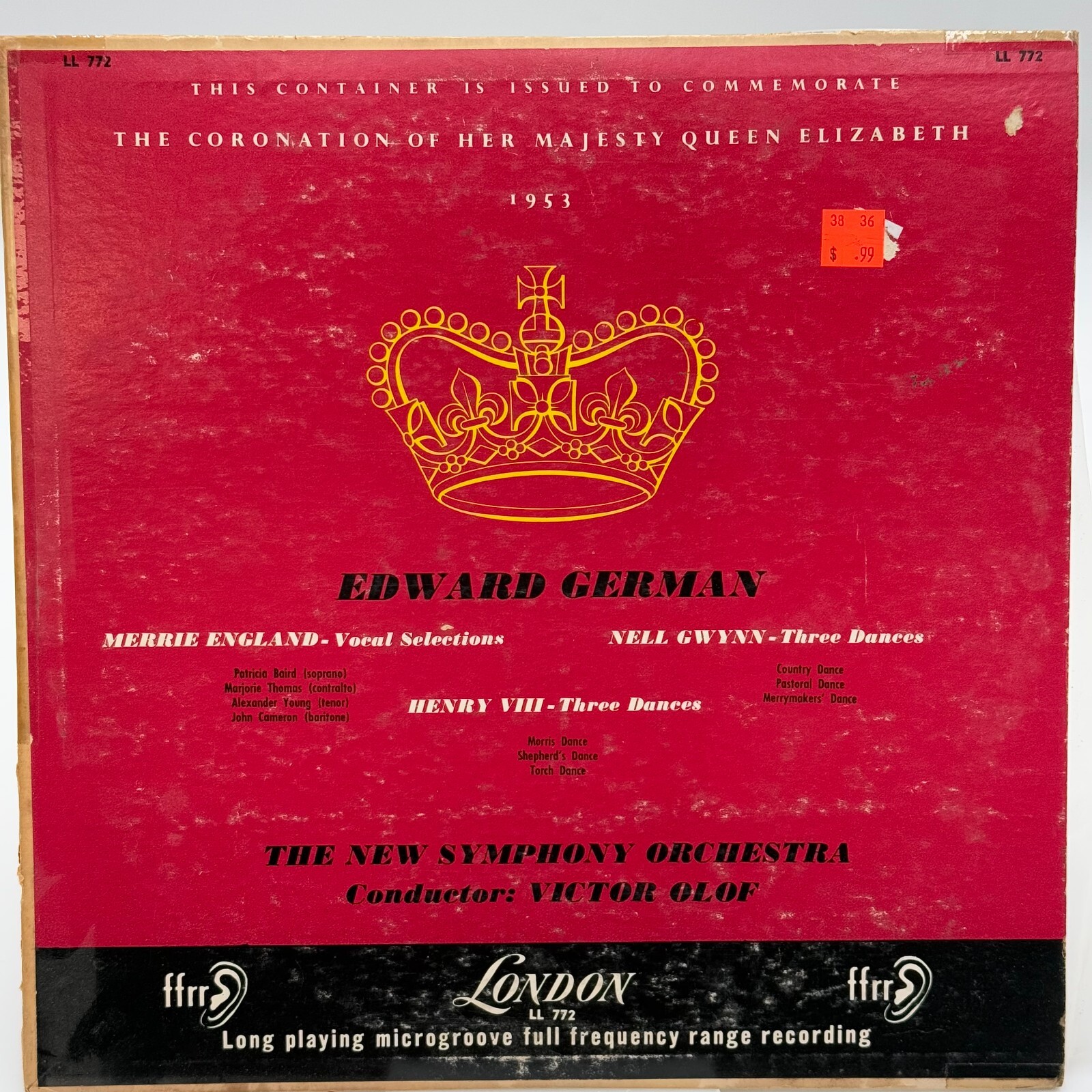 Delve into the world of classical music with the Edward German commemorative record, honoring Queen Elizabeth, Olof, and New Sym London LL 772. This LP features a monophonic rendition, allowing you to experience the nuanced sound of orchestral masterpieces as they were meant to be heard.