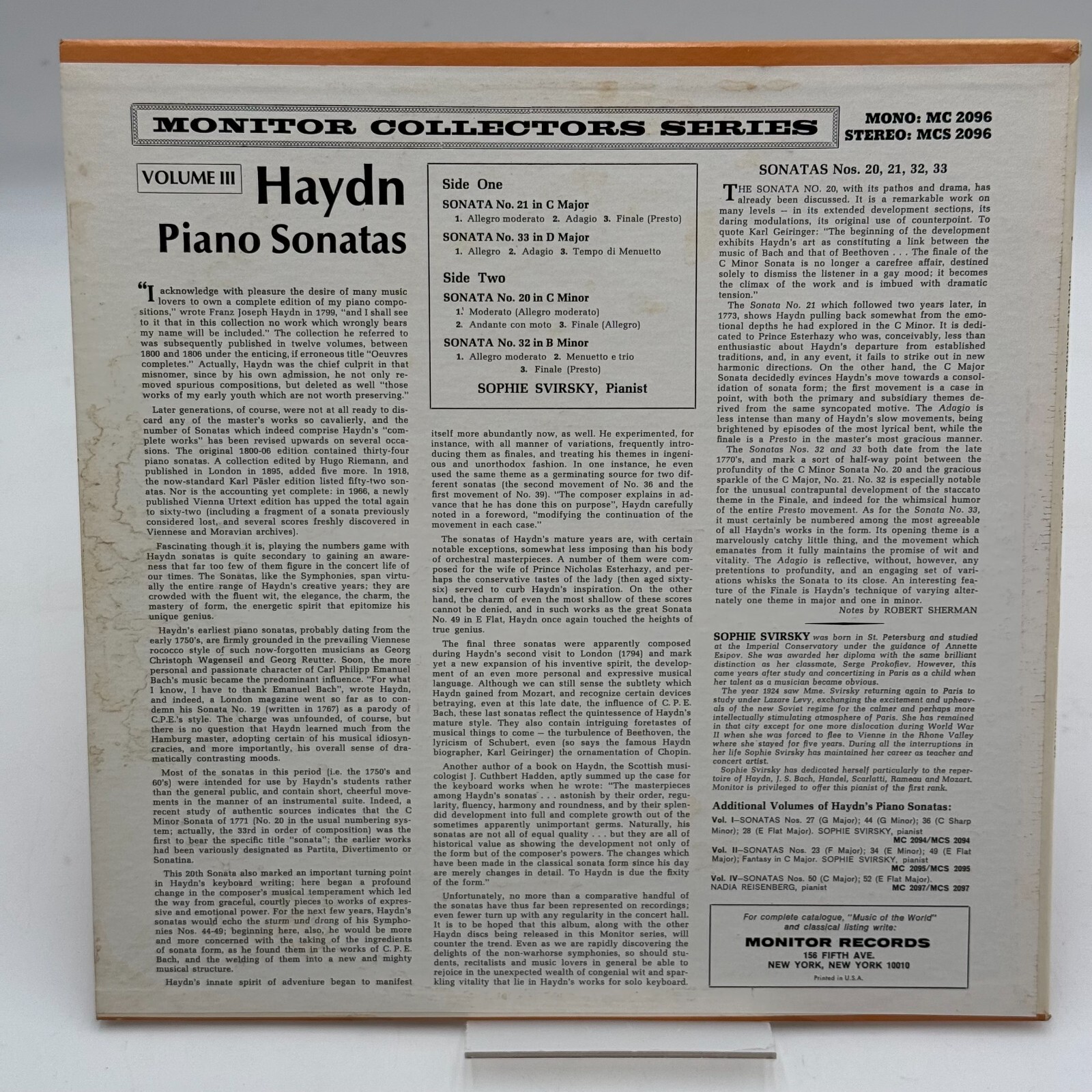 The product is a vinyl LP titled "Sophie Svirsky – Haydn Piano Sonatas Vol. 3" released by Monitor Records.