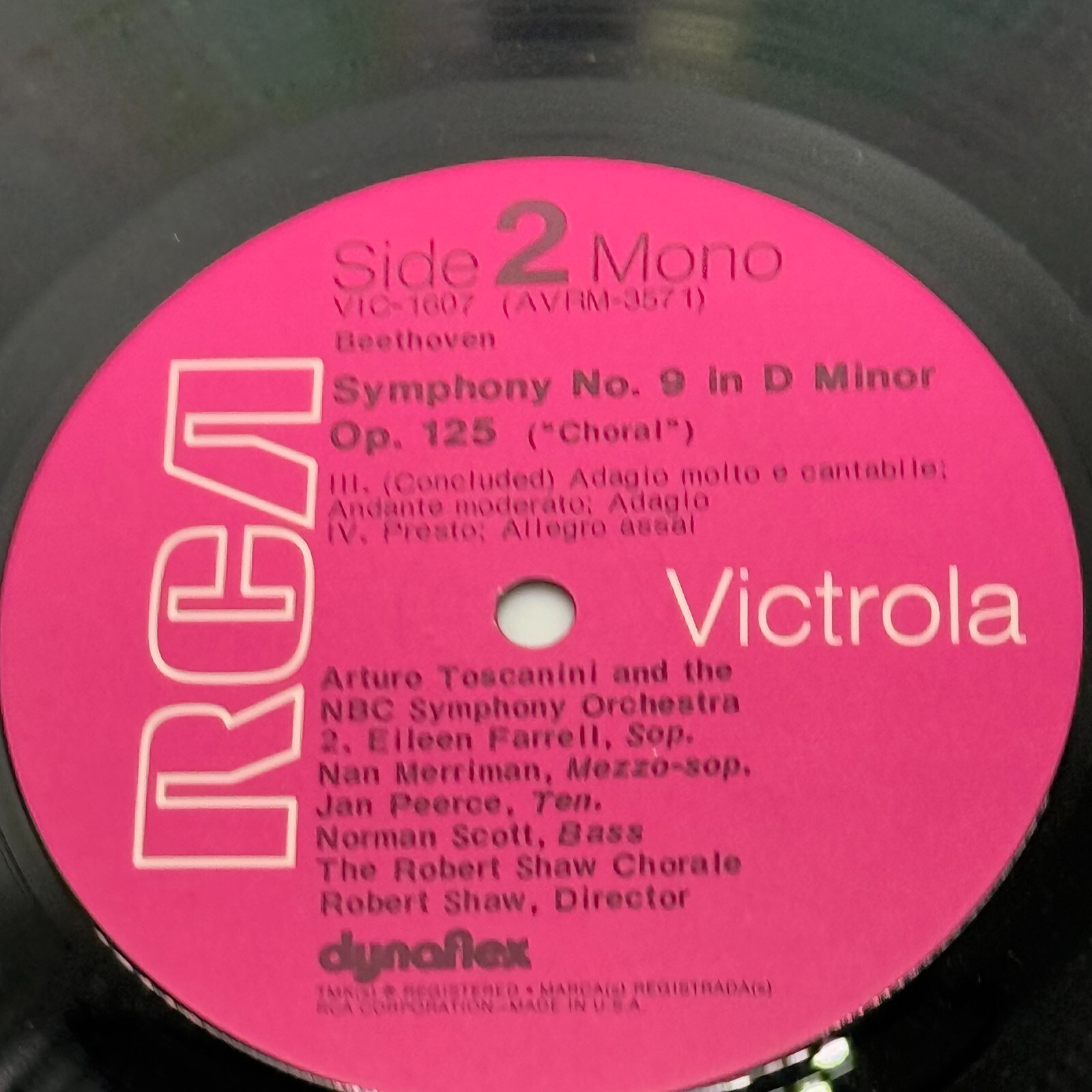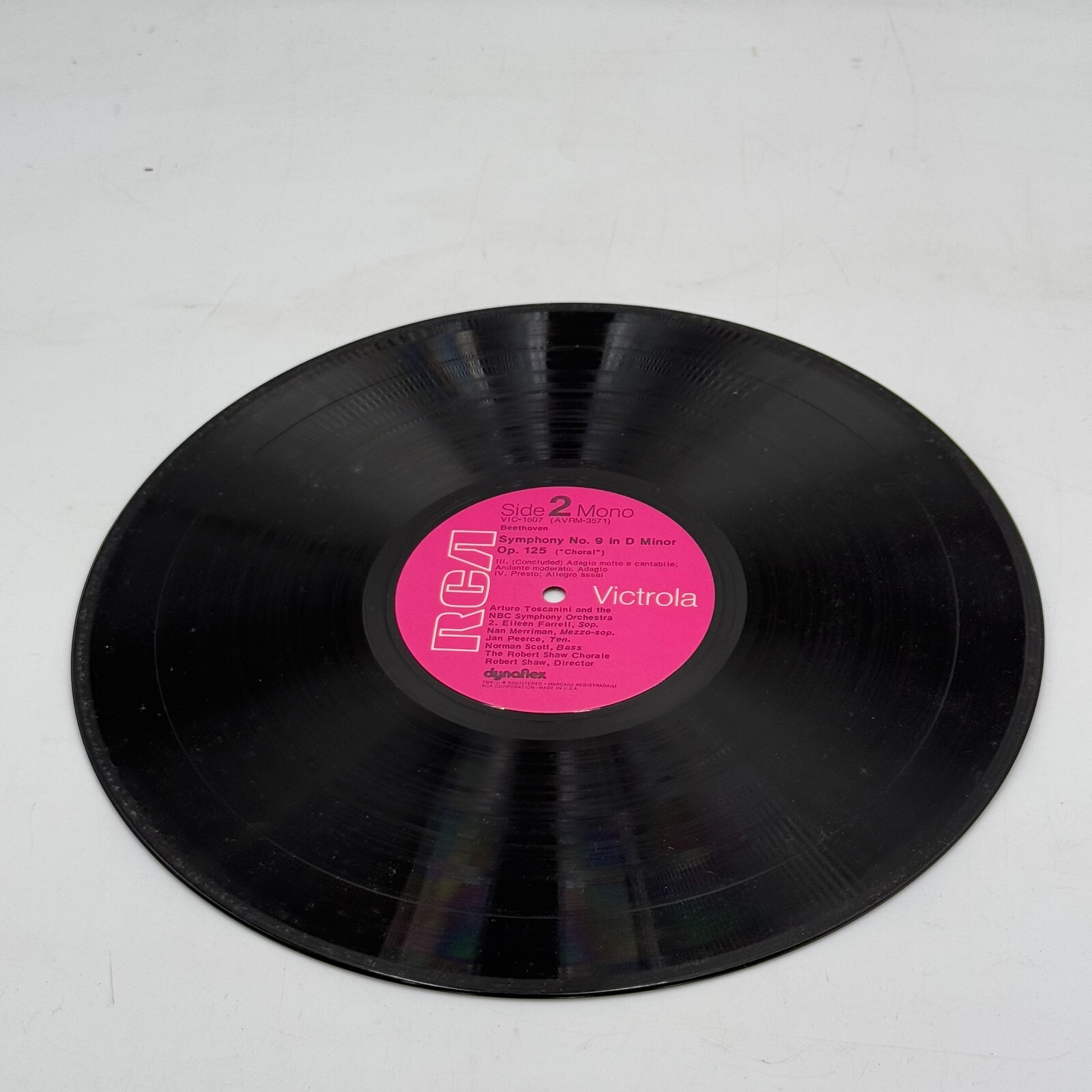 This vinyl LP record features Arturo Toscanini conducting Ludwig van Beethoven's Ninth Symphony, performed by the NBC Symphony Orchestra.