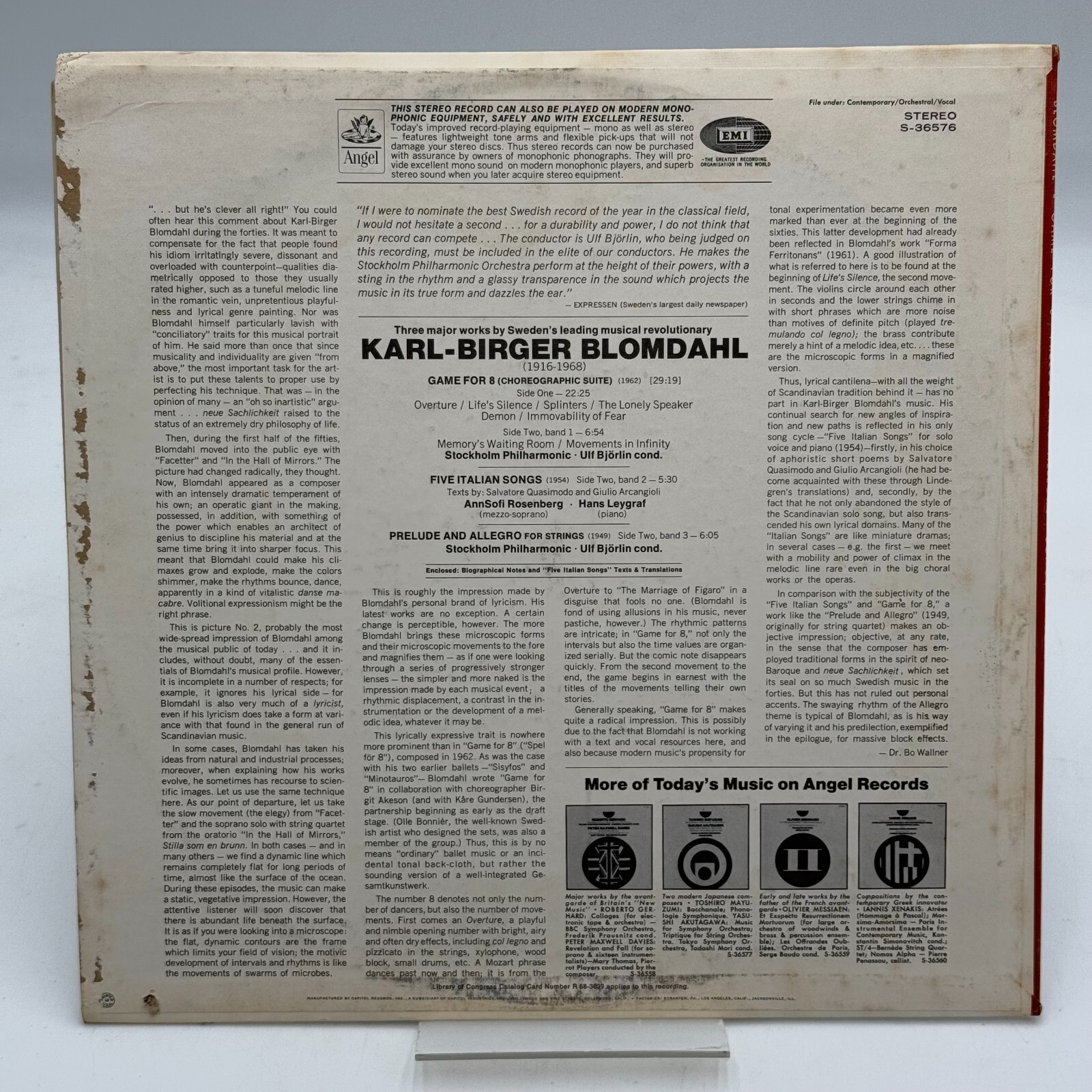 It was released on the Angel record label with the catalog number S-36576 in stereo format. The record is 12" in size and is classified under the classical genre. This vinyl LP is a desirable item for collectors and enthusiasts of classical music looking to enjoy a unique and engaging composition by Blomdahl.