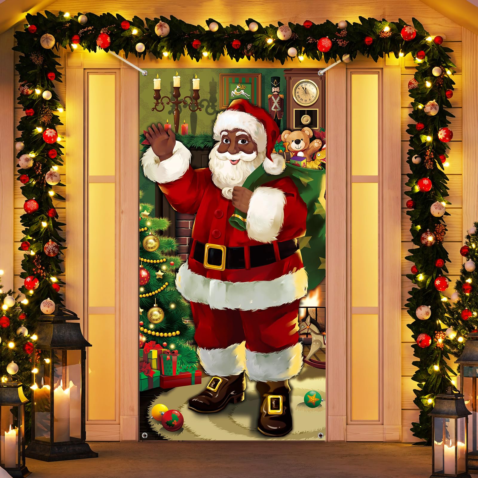 Christmas door cover decoration Christmas Black Santa Claus door cover Xmas door hanging banner Christmas Santa background banner for home front door holiday Christmas decoration