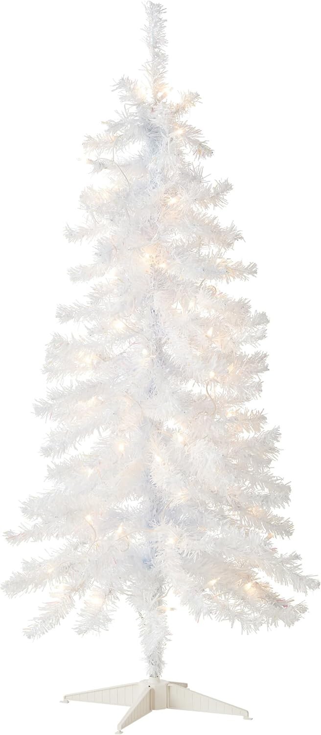 This Tinsel Pre-Lit Artificial White Christmas Tree is 4 feet tall with a 24 inch base diameter. Create a winter wonderland in your home with this stunning and lifelike tree.