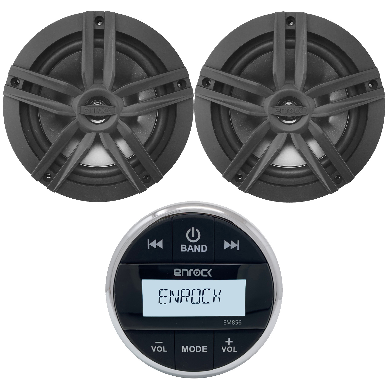 Enrock EM856 Marine AM/FM Radio USB Bluetooth Water Resistant Stereo Receiver Bundle Combo With One Pair (QTY 2) Of Enrock EM265B 6.5" 180 Watt Max 2-Way Water-Resistant Black Speaker