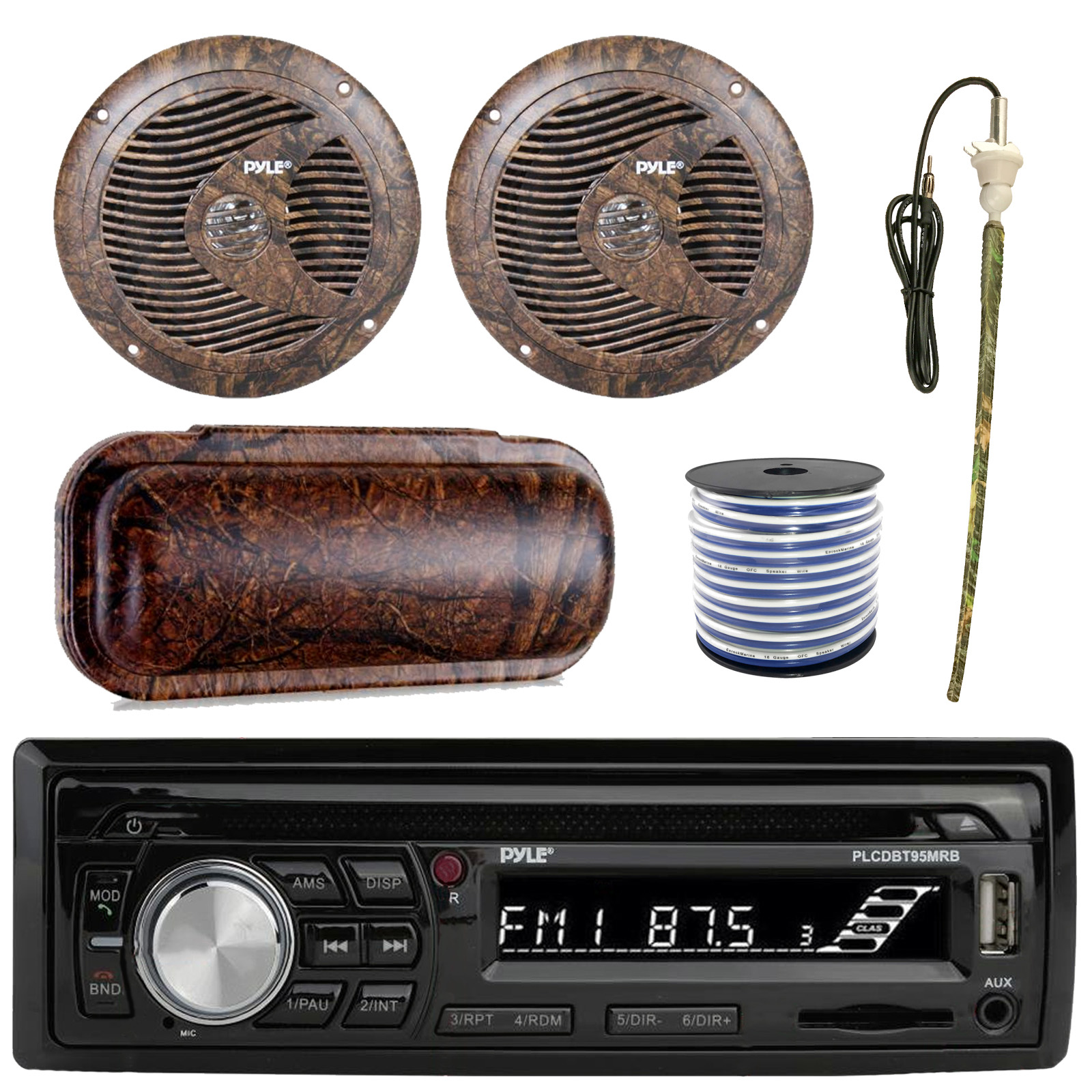Pyle Marine Single-DIN Bluetooth MP3 USB AUX AM/FM Radio CD Receiver, Pyle 6.5'' Waterproof Camo Speakers (Pair), Stereo Shield Cover, Enrock Camouflage Boat Antenna, 18-G 50 Ft Wire