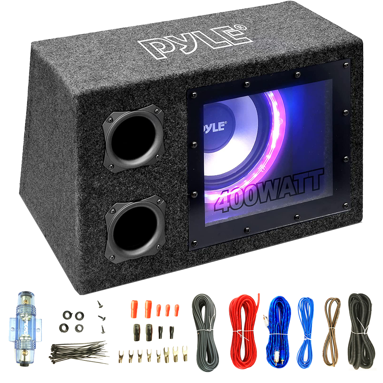 Pyle PLBNPS18 8" Single Series 400W Rear Vented LED Subwoofer Enclosure w/Remote Budle Combo with 8 Gauge Amplifier Wiring Installation Kit