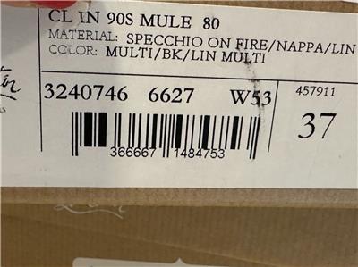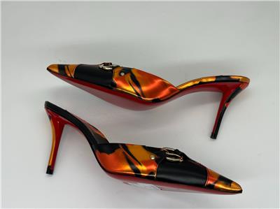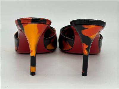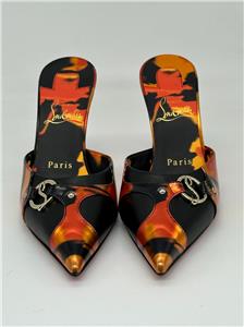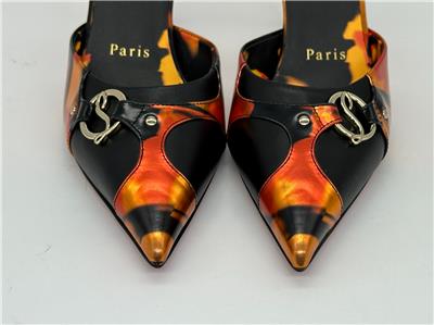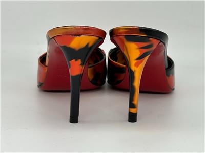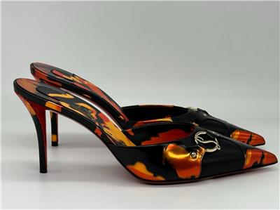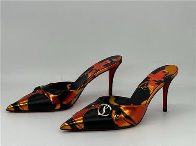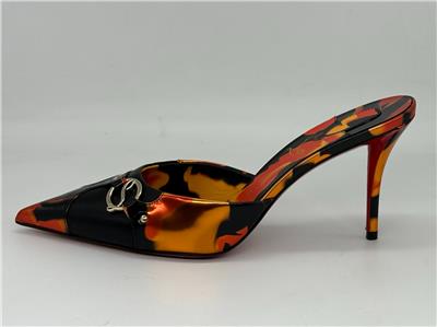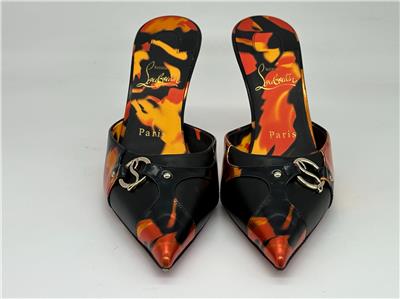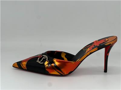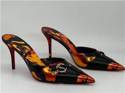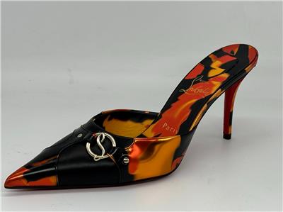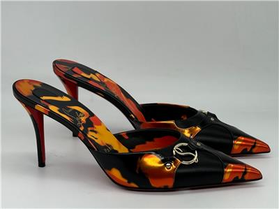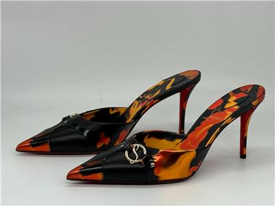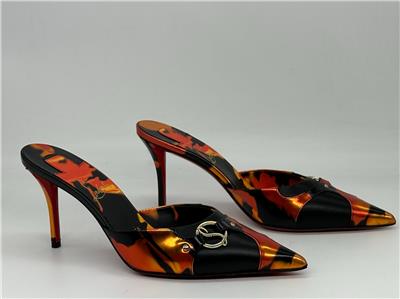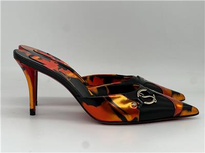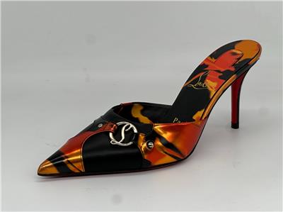 - Gleaming silvertone logo hardware connects the fire-patterned overlays on this pointy-toe mule set on a willowy stiletto heel and finished with a Loubi-red sole. 80mm heel. Leather upper, lining and sole Made in Italy