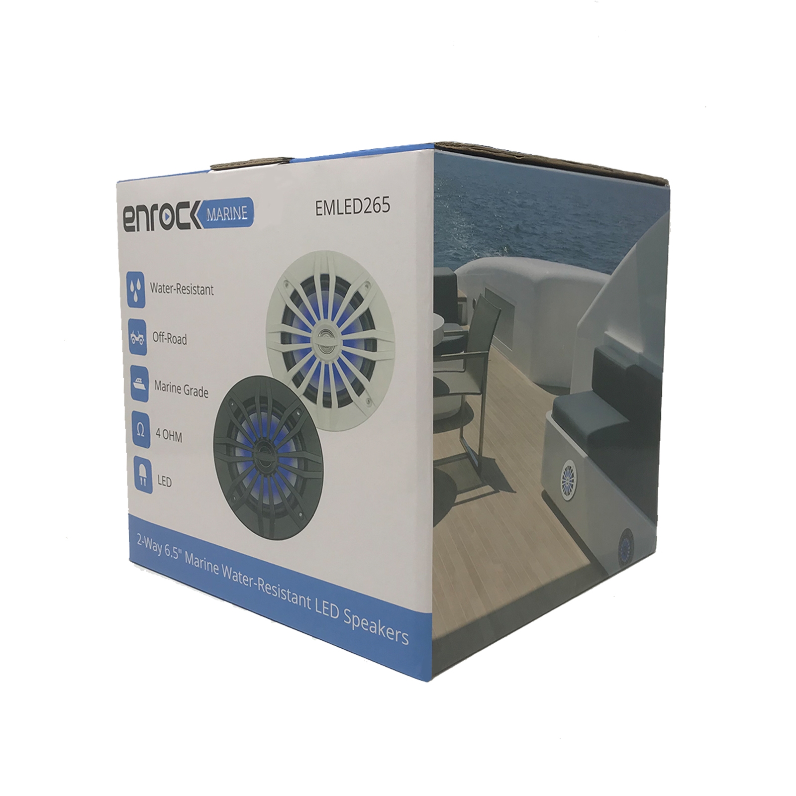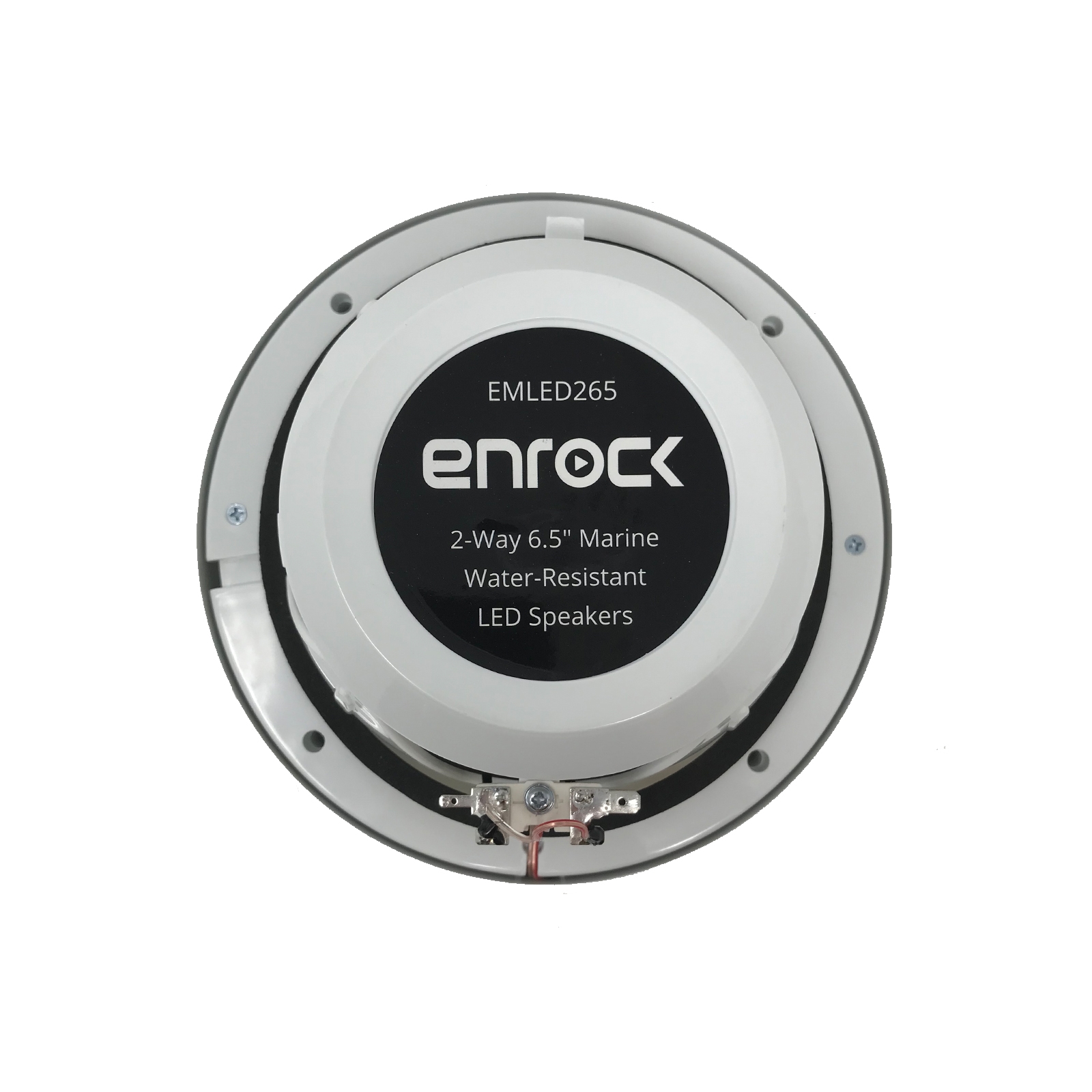 Enrock EMLED265W marine speakers combine sturdy, marine-ready design, unresolved audio performance, and the cool vibe of subtle blue lighting. These rugged speakers transport powerful output that'll cut through wind, water, and engine noise, while the built-in Blue LED lighting will light up in harmony with your beats.
