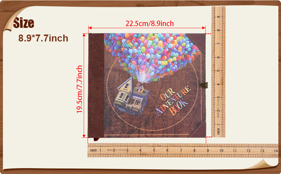 Scrap book for pictures: 7.7"L x 8.9"W x 0.9"H.73 sheets(146 pages) hold over 300 photos.Our Adventure Book Scrapbook has a sturdy craft paper bag on the back,can store stamps,travel tickets,etc.