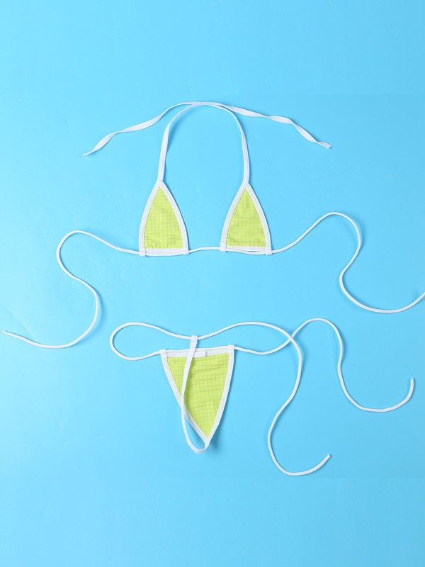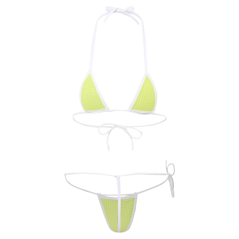 Halter bra top and thong with self-tie straps are adjusable to fit body. Glittering sequins makes you more eye-catching.