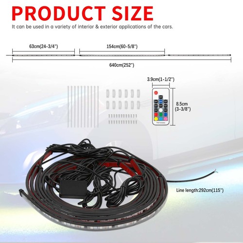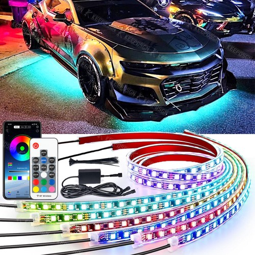 About this item 【Dream Color & Super Long Chasing Light】 Built-in 1000 Kinds of Color Chasing Modes looks like recurrently chasing, skipping, dancing, twinkling on the strip. You also can mark your favorite chasing effect. 16 million colors for you to DIY a static color for lighting. 【Easy to Install】-The car underglow LED lights are equipped with 2 lines connecting 6 strip lights. 4 x 24.7 inch + 2 x 60.3 inch light strips design . Flexible tubing can be bended around corners easily. Strong 3M adhesive, zip ties even fixing clips and screws equipped it hold it on place firmly definitely. You can install them in various cars, like SUVs, trucks, Jeeps, JK, Vans, Boats, JL, pickup off road, UTV, motorcycle Decorations Specification Item dimensions: Number of pieces: 6PCS Strips Package Include
