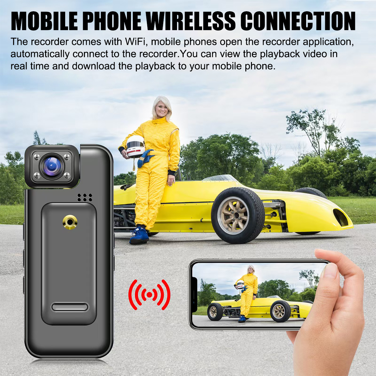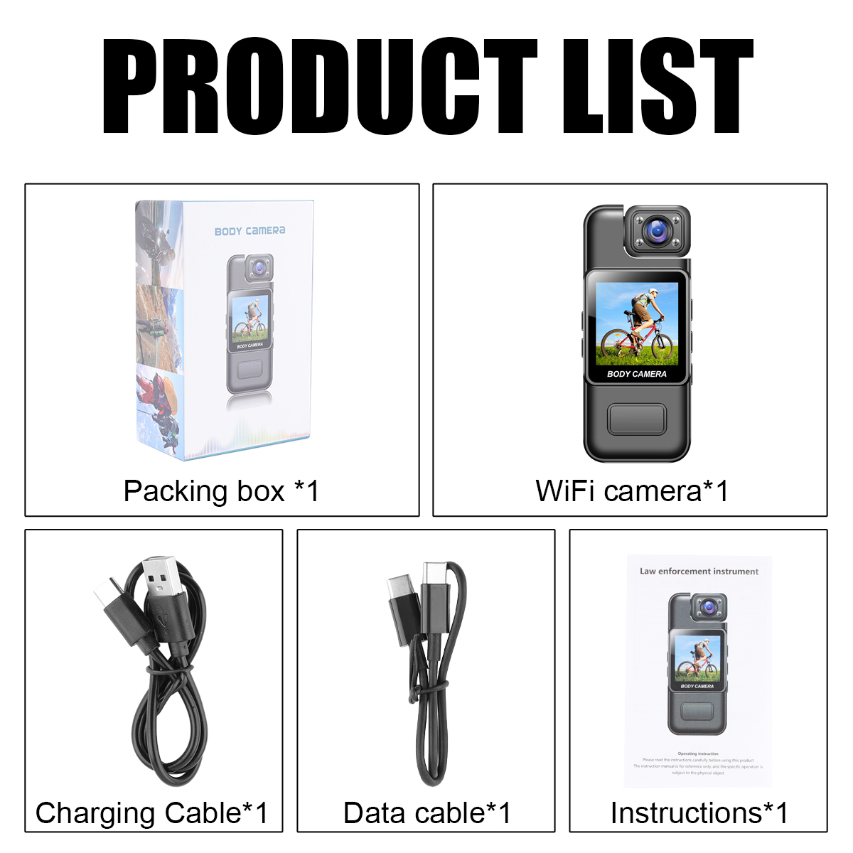 *Main features: WiFi, video recording, photo taking, audio recording, loop recording, motion detection, infrared night vision, file viewing, file deletion, formatting, back clip.