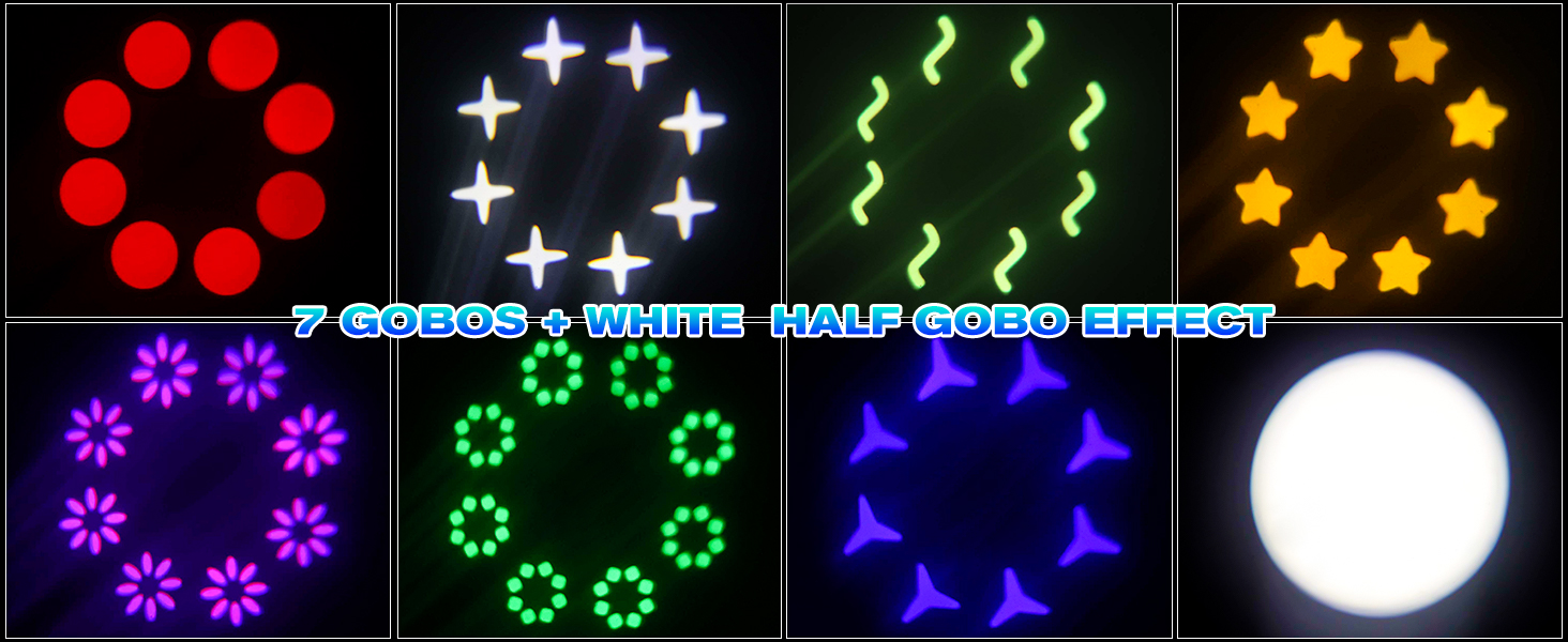 | Gobo wheel | 7 Gobos + white + Gobo shaking + Gobo rotating speed |