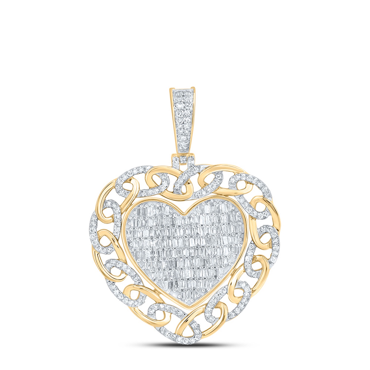 This eye-catching diamond Cuban Chain Heart Frame Pendant is crafted in solid 10k Yellow Gold and shimmering White Diamonds, ensuring sparkle from every angle. Radiant with 1 ct. t.w. of Diamonds, this pendant is polished to a lustrous shine. Exclusive style has a well built frame to withstand everyday wear and tear. The Diamonds are secured in Prong & Invisible setting close together, making the overall appearance larger and lustrous. A matching bail to compliment this pendant. These are all 100% genuine Baguette & Round cut Diamonds with matching clarity and color throughout. This Pendant measures 1.50" long and weighs approx. 5 gr. This style would make a perfect addition to your jewelry collection.