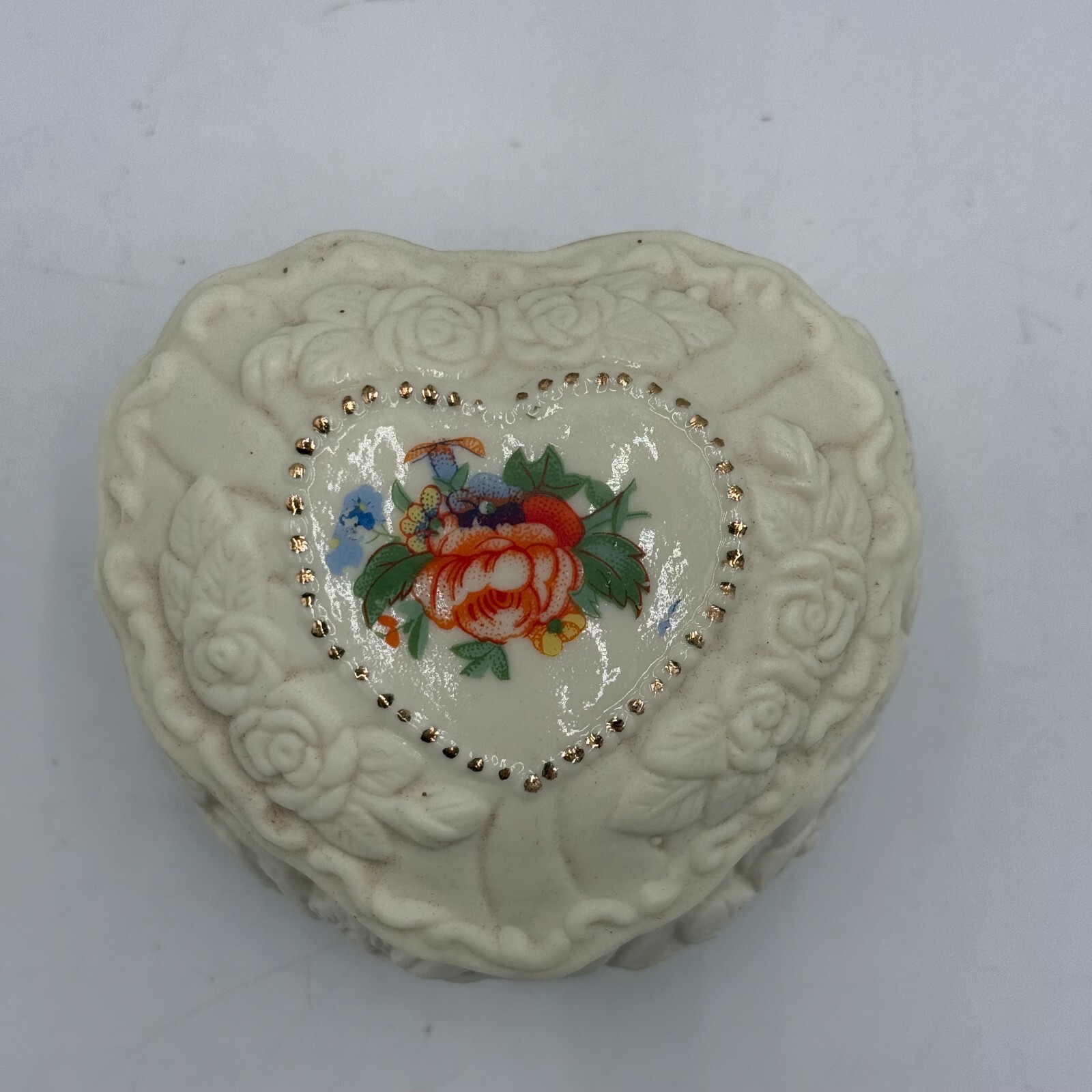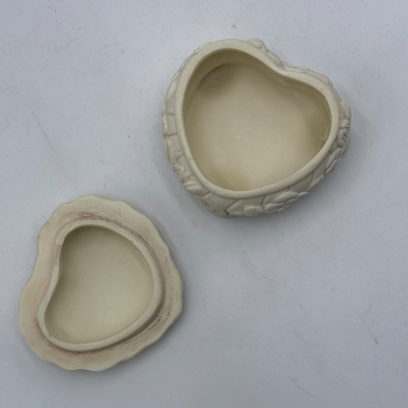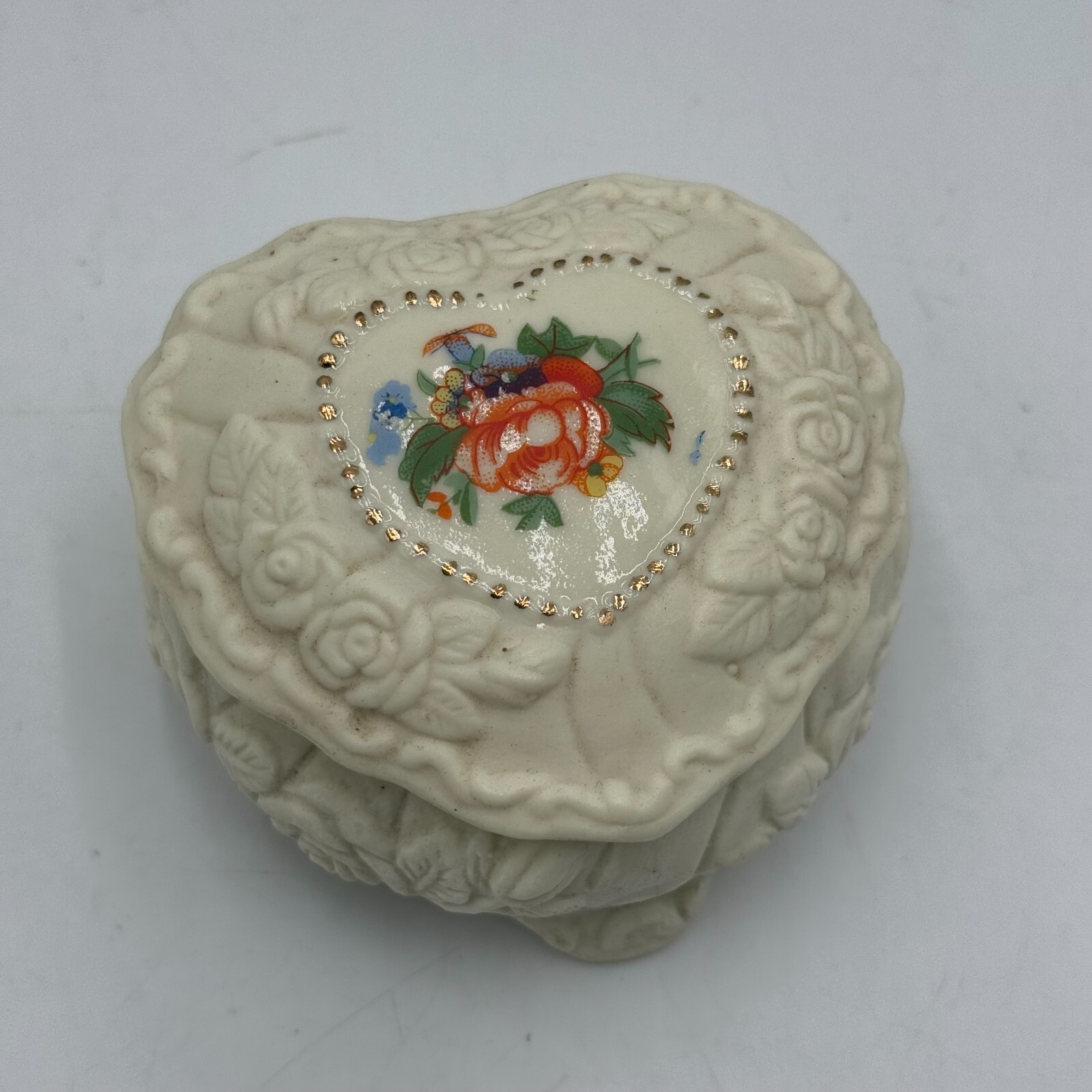 Keep your cherished keepsakes in this charming white ceramic trinket box, elegantly adorned with a heart-shaped design and a delicate floral pattern. The vintage vibe of this piece is heightened by its quaint size, making it a perfect accessory for your vanity or dressing table.