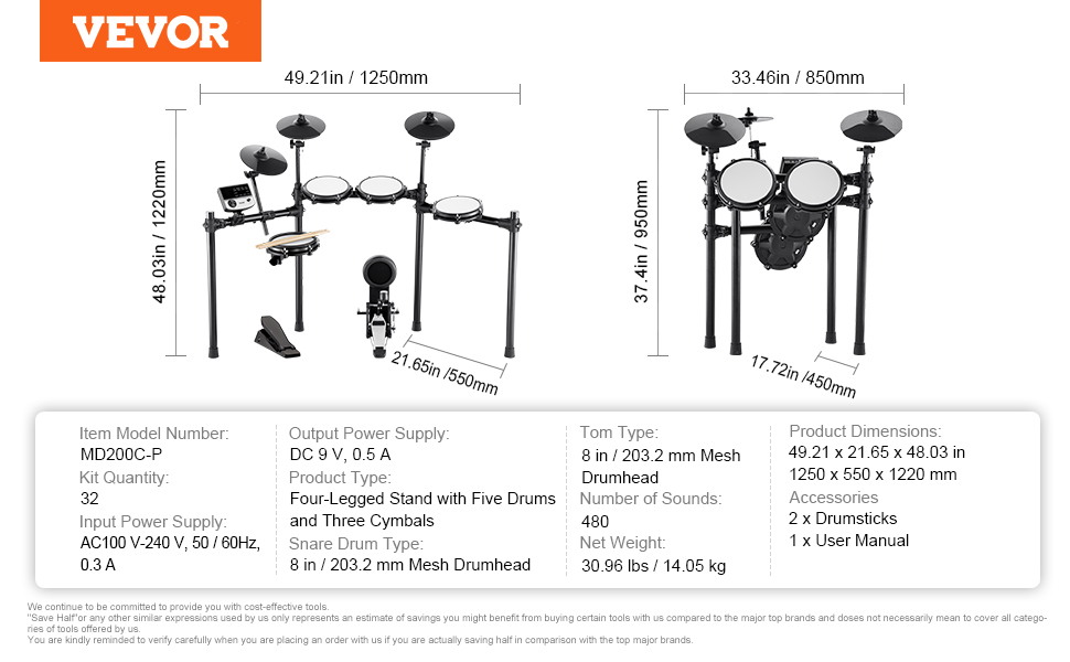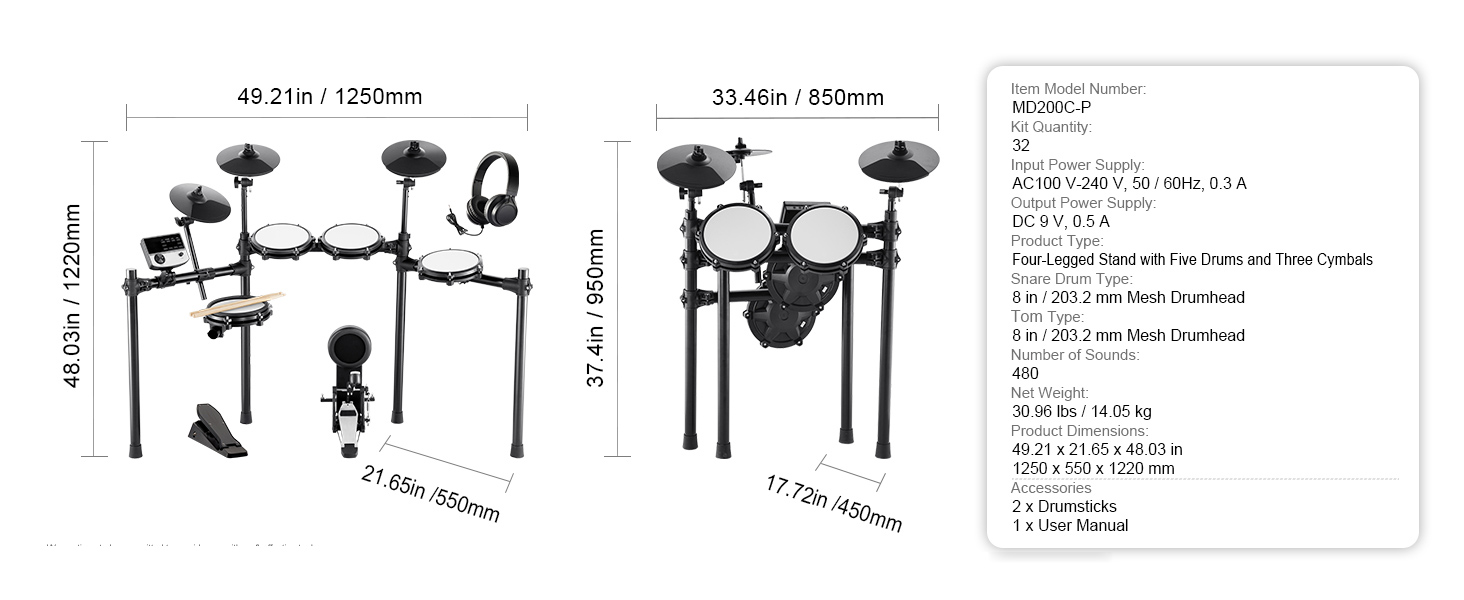 Diverse Sound Options: Choose from 480/150+ sounds and 32/15 drum kits that cover a range of percussion styles. With 30/10 demo songs and 3 practice modes included, you can develop your drumming skills - making this electronic drum set a fantastic choice for beginners!