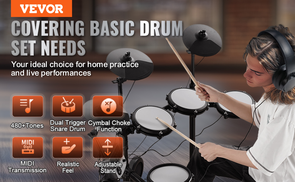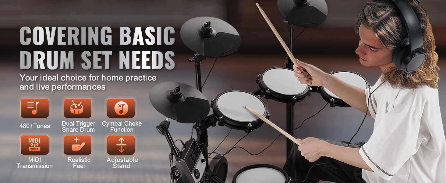 Our electric drum set has over 480/150+ sounds for diverse styles. MIDI support makes recording and composing a breeze. You'll have everything you need with a dual-trigger snare and crash cymbal mute. Plus, the sturdy adjustable stand fits players of all levels.