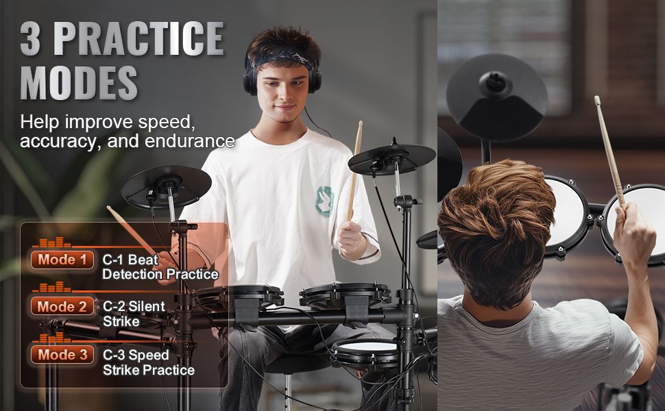 Boost your skills with three modes: C-1 for beat detection, C-2 for silent playing, and C-3 for speed practice. Enhance your speed, accuracy, and endurance in every practice session!