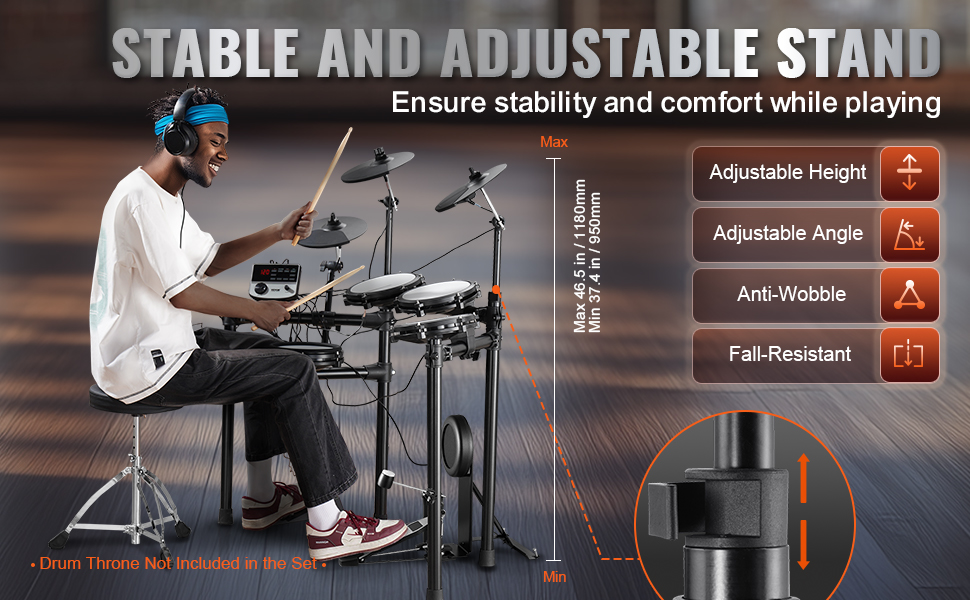 The adjustable stand allows you to customize the height and angle to suit your playing style. Its robust structure ensures your drum set stays steady, even during intense sessions, so that you can concentrate on your playing.