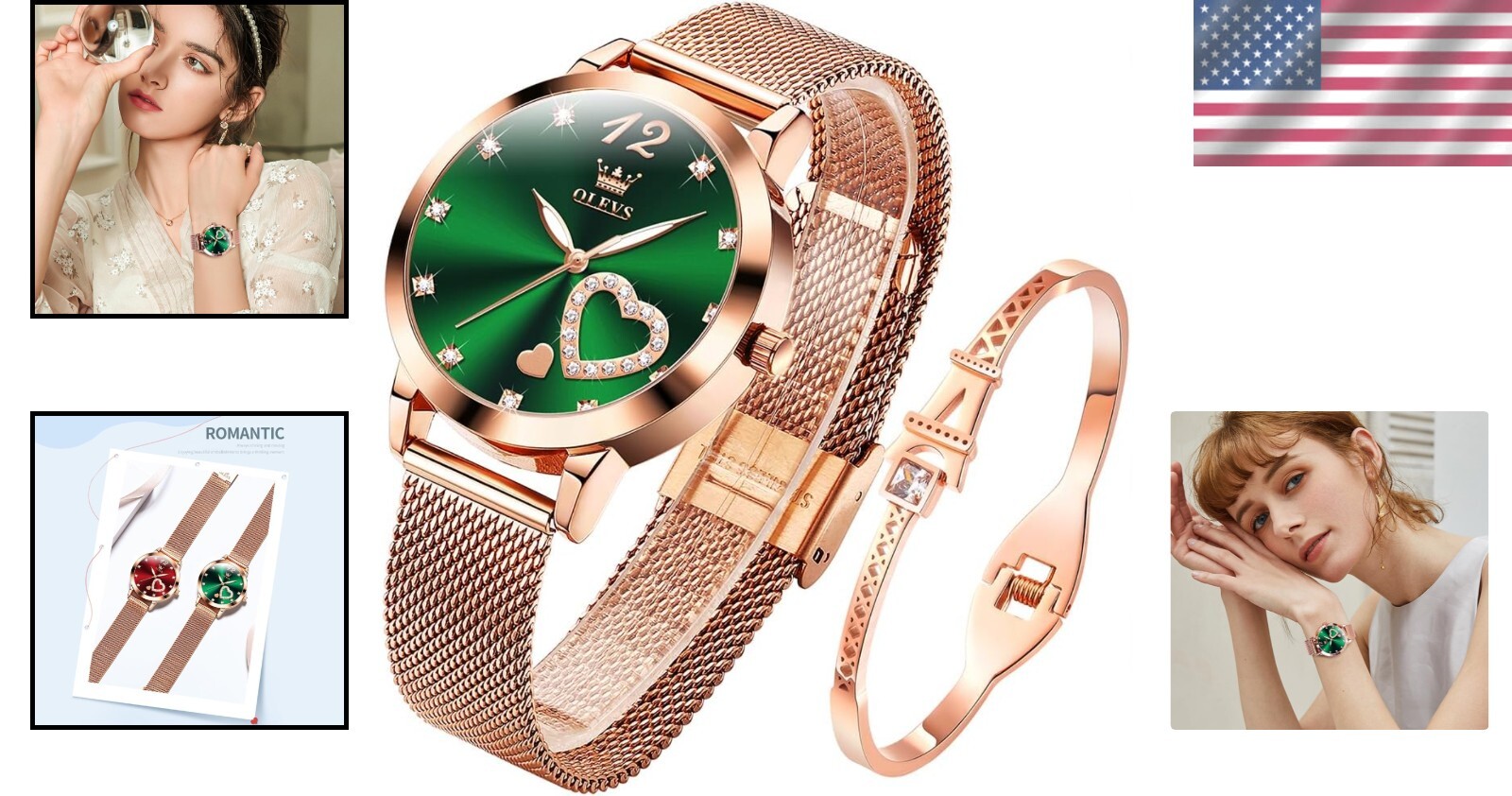 | Features: Diamond Accent,Waterproof,Adjustable Mesh Band,Calendar,Quartz Movement,Slim Design,Hook Buckle | Dial Color: Green | Band Color: Silver | Bezel Color: Rose Gold |