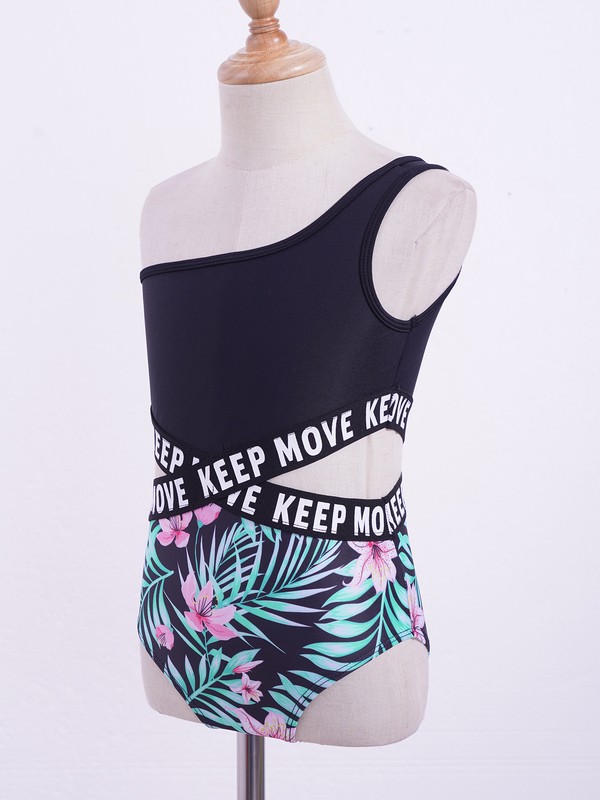 Kinder Mädchen Asymmetrisch Single Schulterumfang Träger aushöhlen Taillenumfang Schwimm-Body aus Gurtband mit Buchstaben bedruckt.