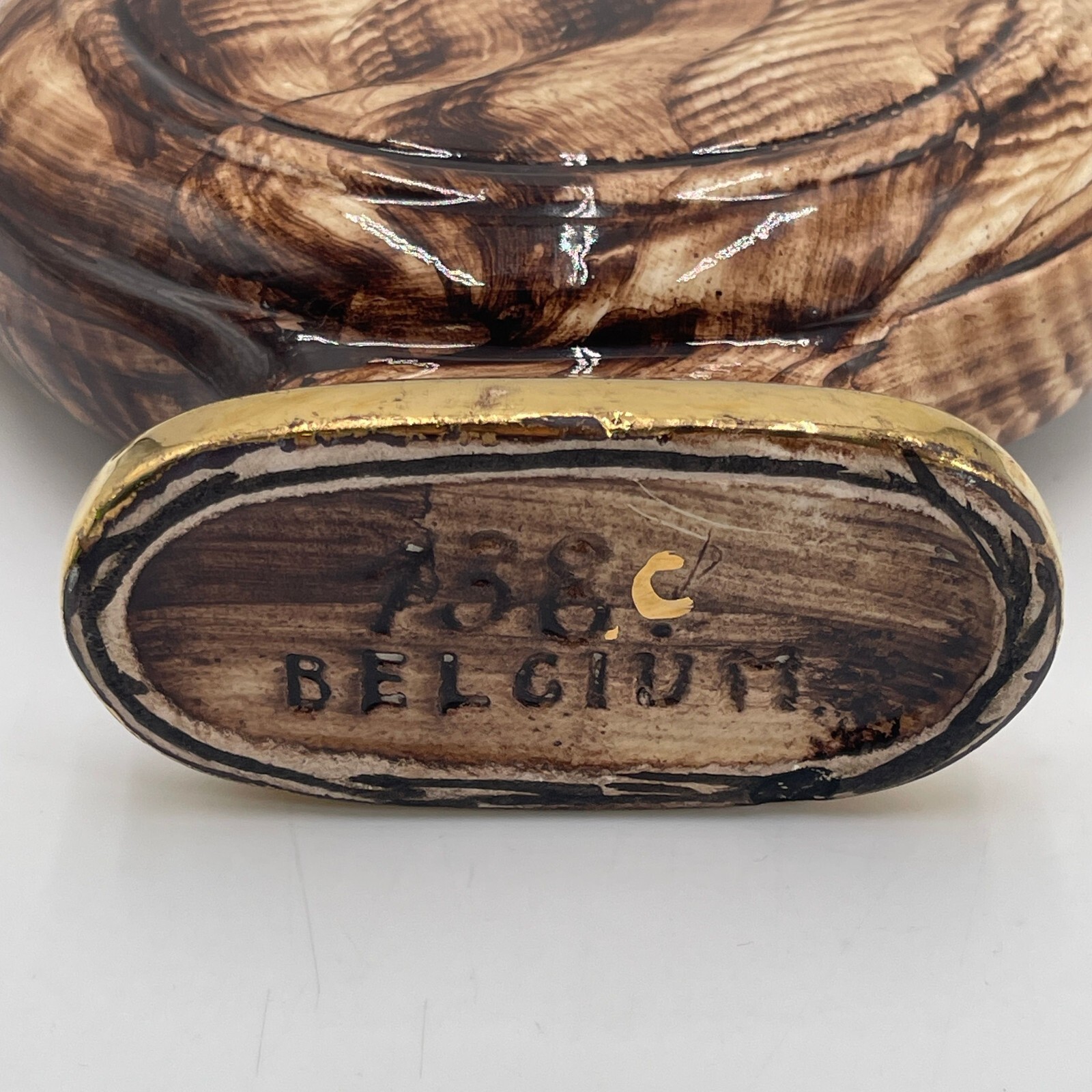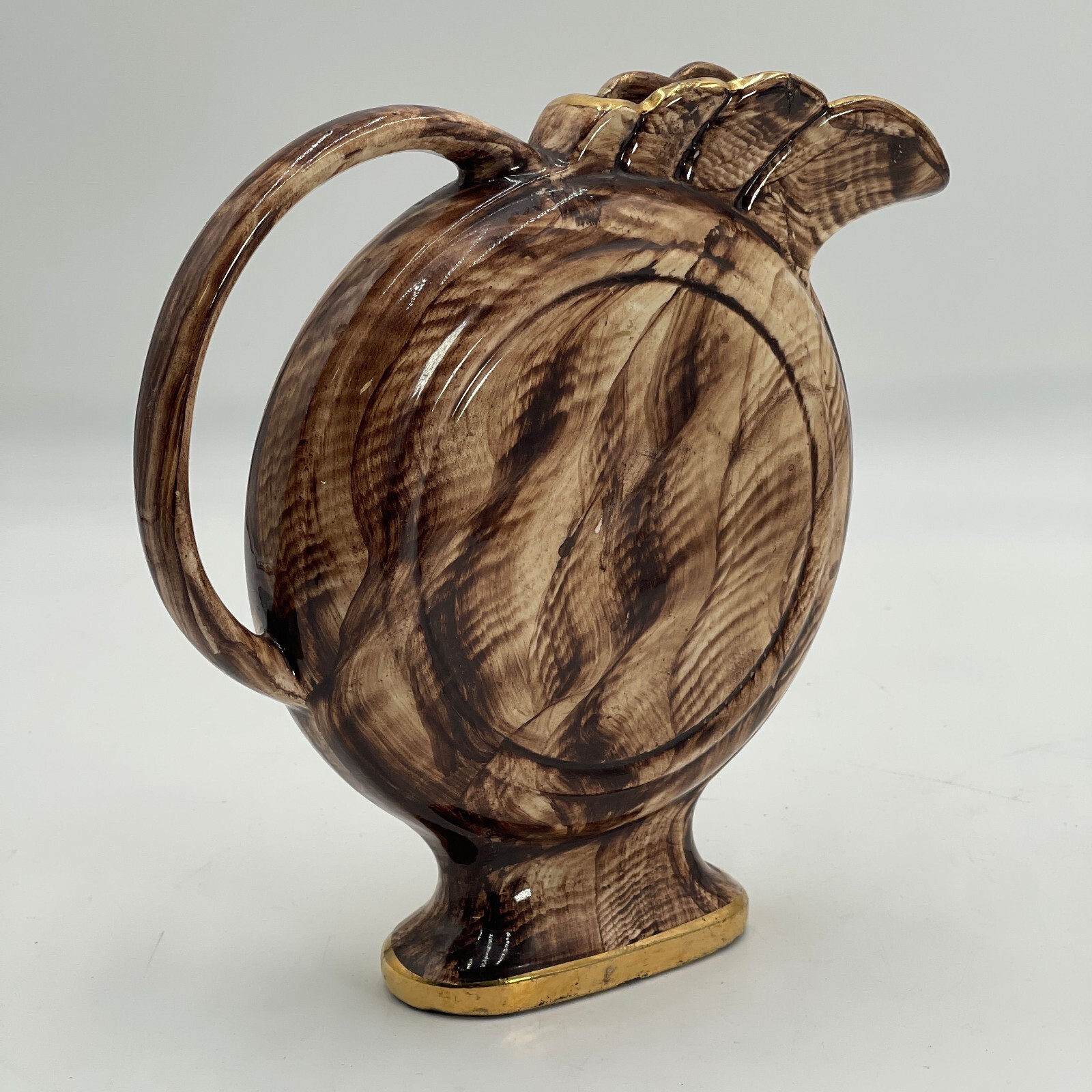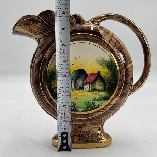 This medium-sized ceramic pitcher from H. Bequet Quaregnon in Belgium features a charming country cottage style with colorful hand-painted details.