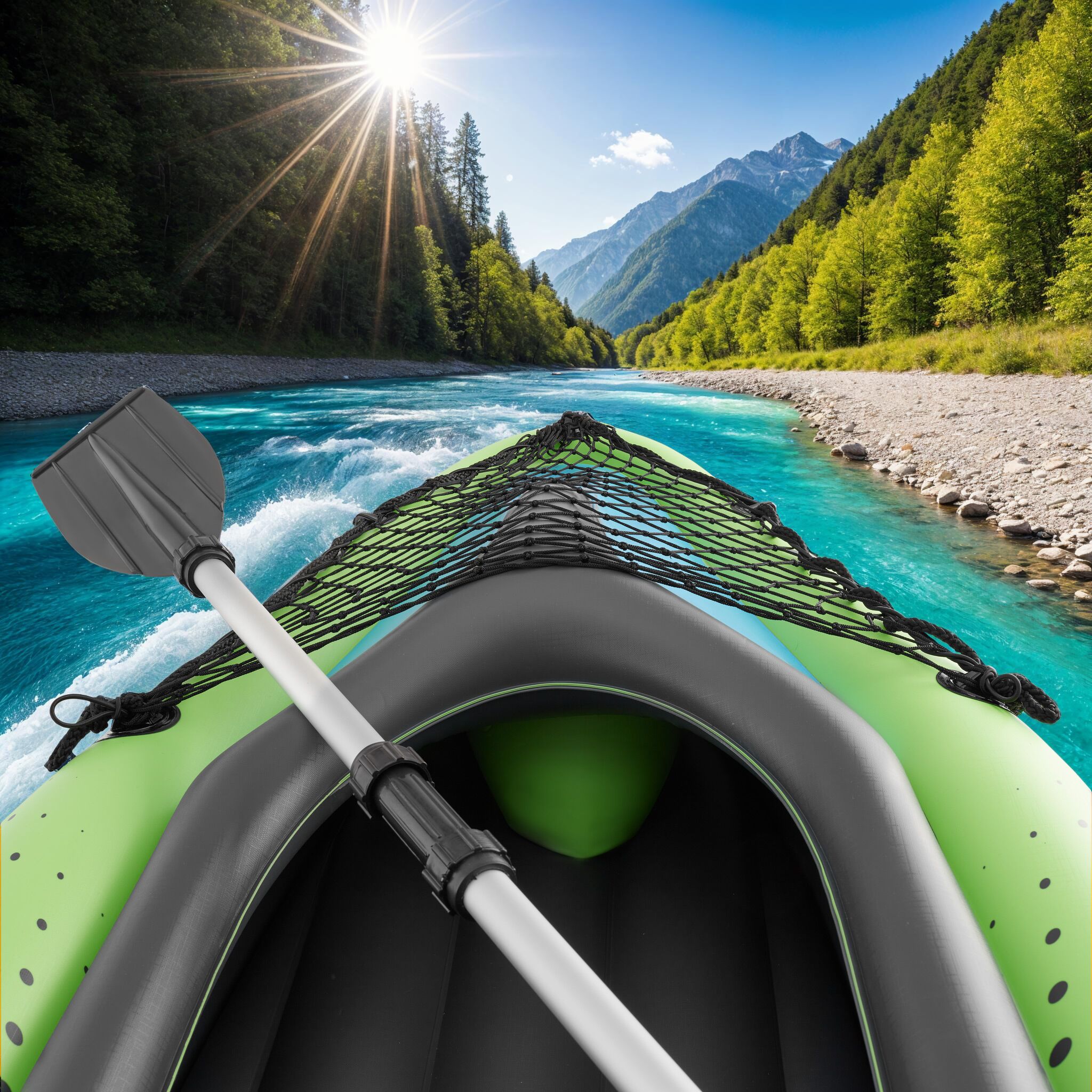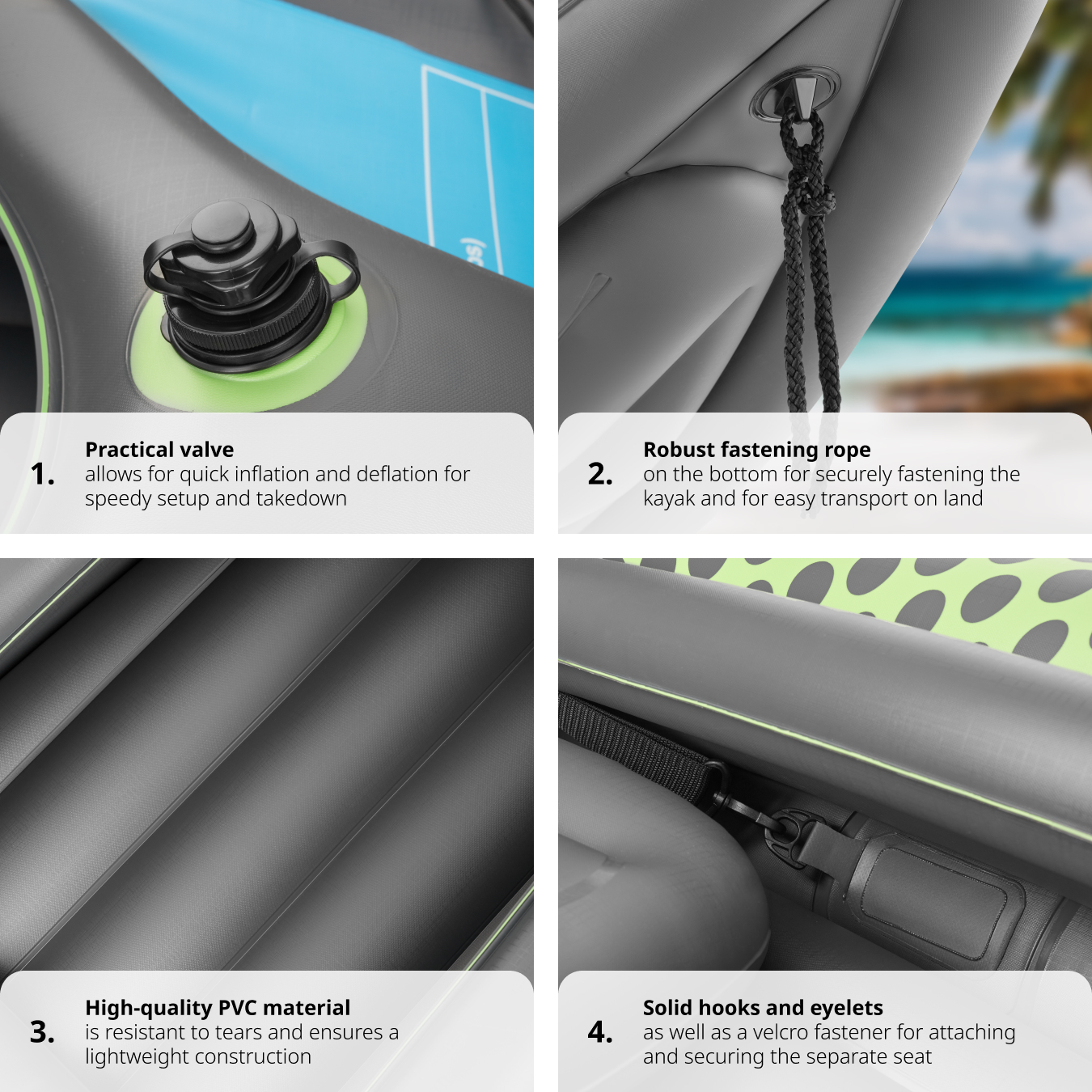 - Inflatable kayak made from durable PVC material