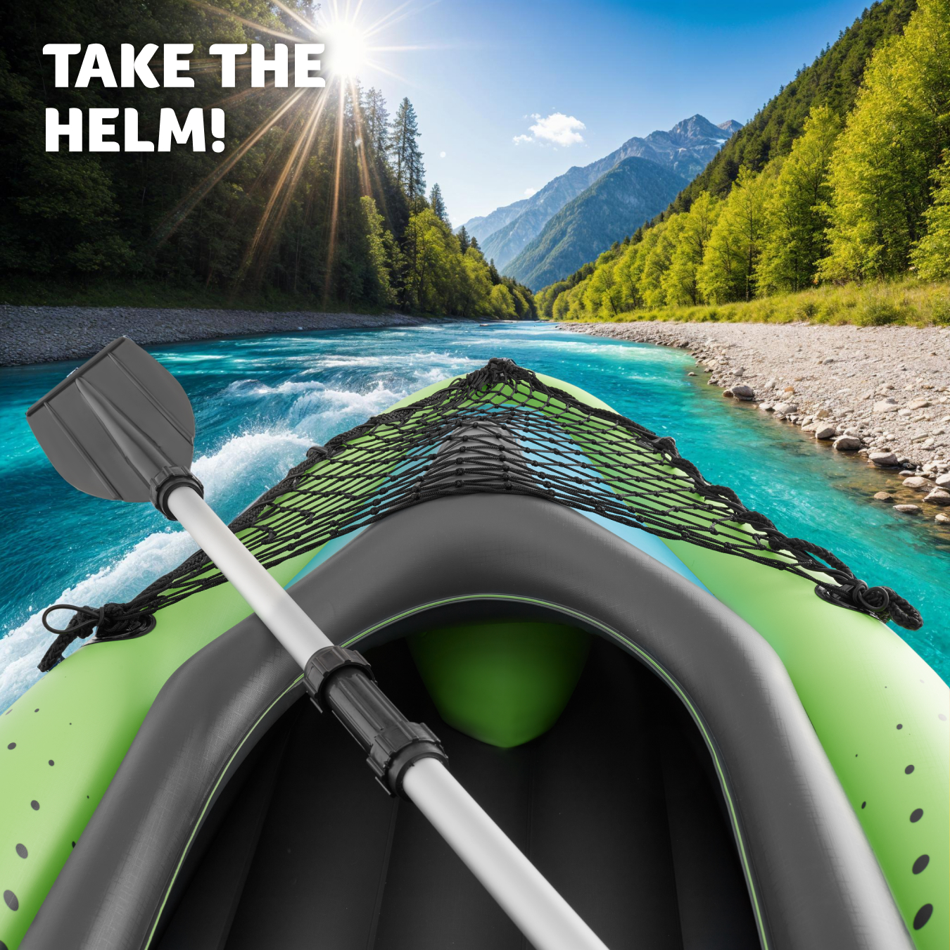 The included double-action pump allows for quick and effortless inflation of the kayak. The high-quality Boston valves with two sealing plugs ensure that no air escapes, so you can enjoy your time on the water without worry. Two storage net accessories on the kayak provide ample space for luggage, which you can use to safely store all your important gear.