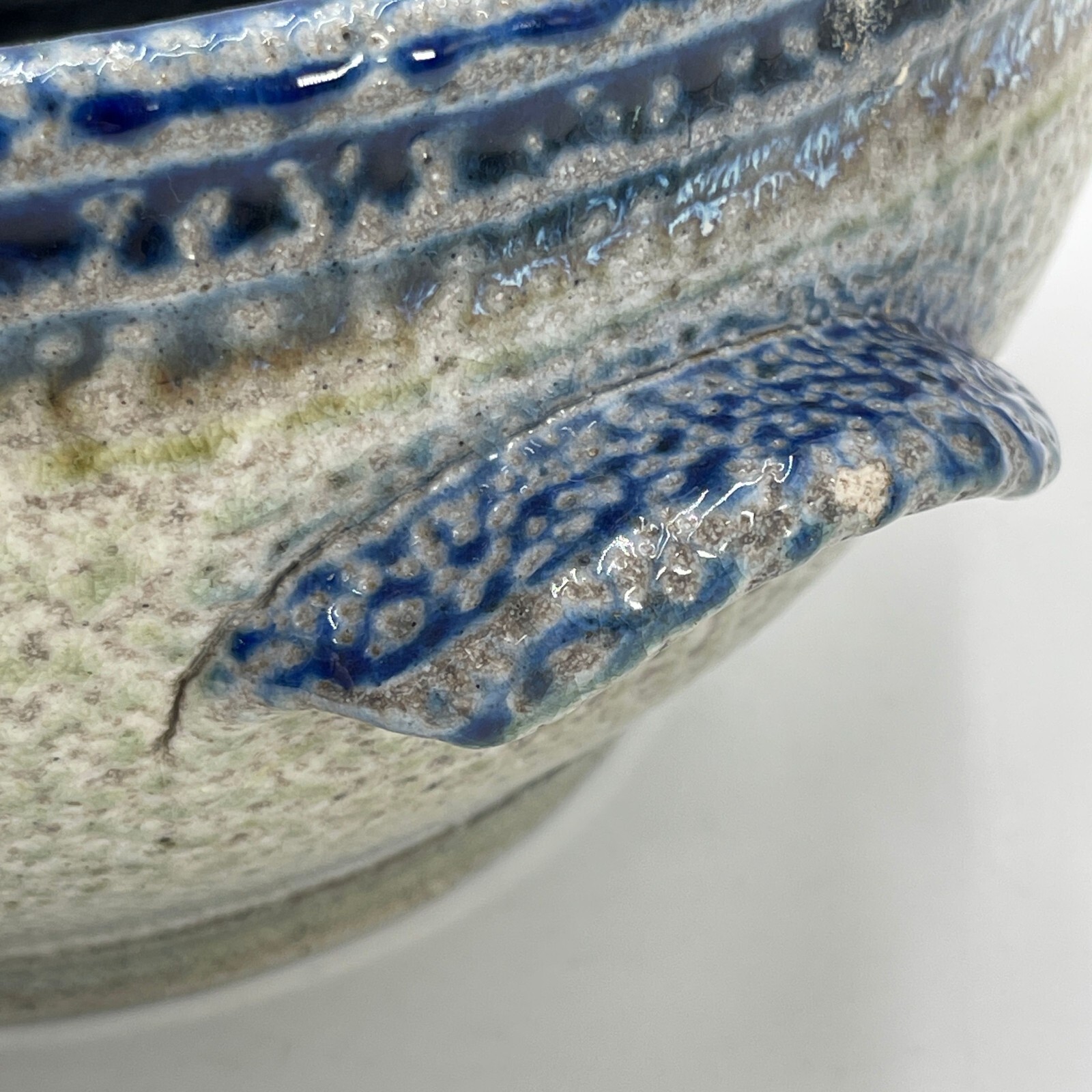 This vintage antique pottery bowl is round in shape with blue and brown colors.