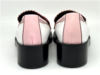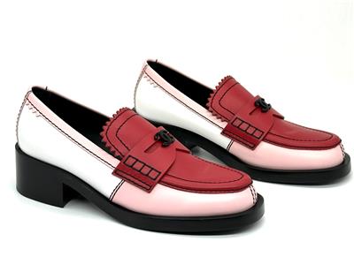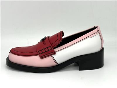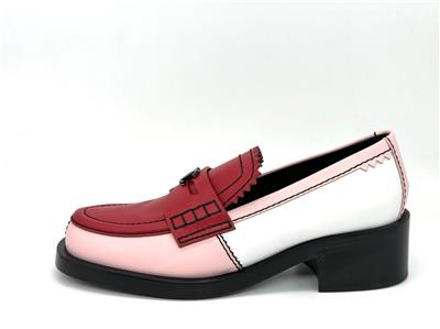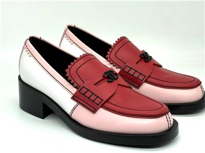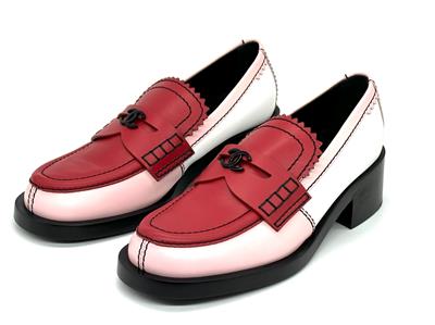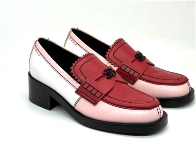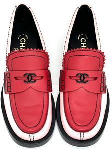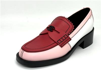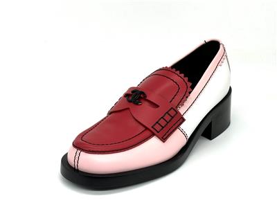 Multicolor calfskin leather slip on loafers feature a black colored CC logo on the vamp. 1.5" stacked heel. Contrast black stitching. Padded leather insole. Leather sole.