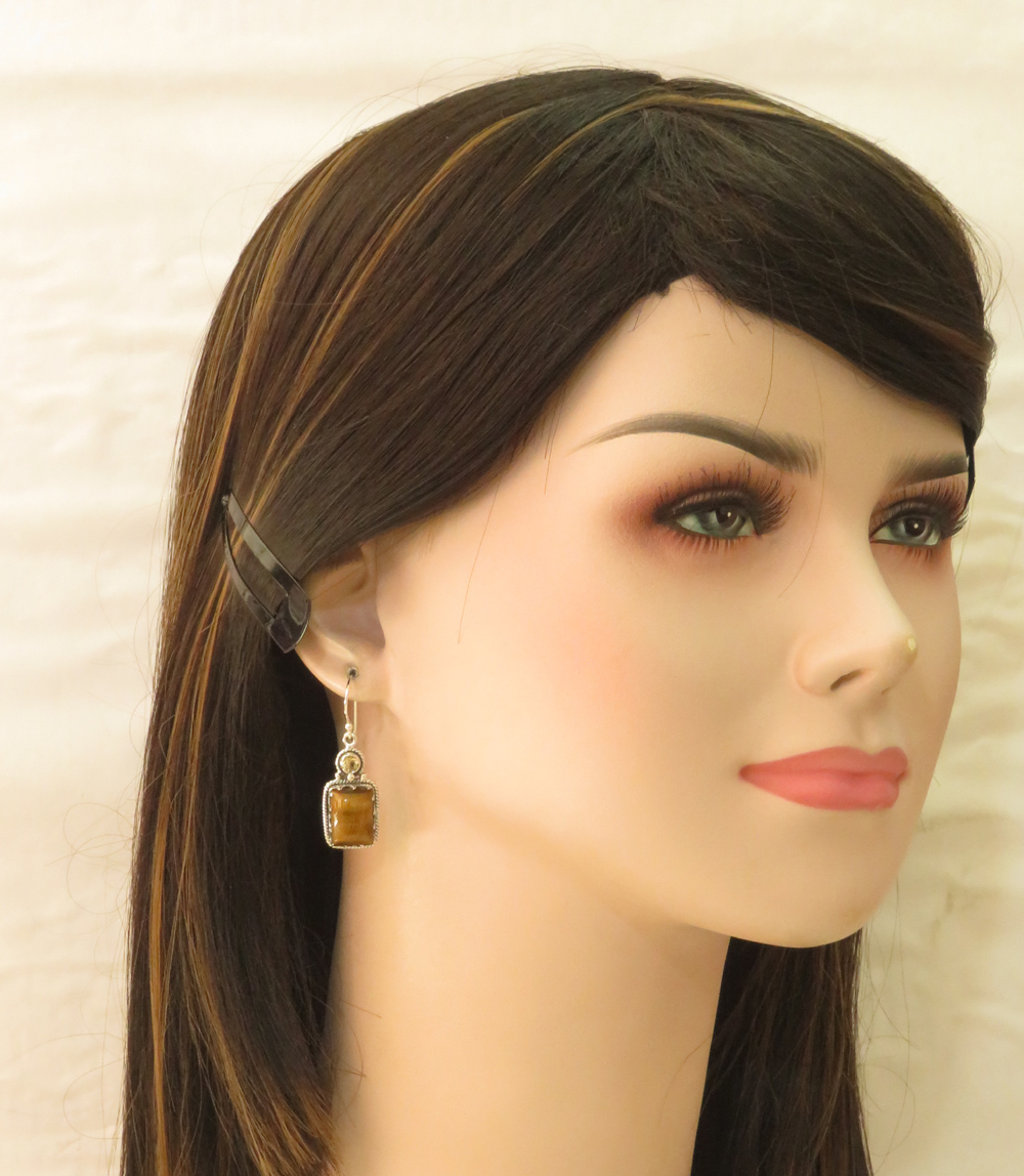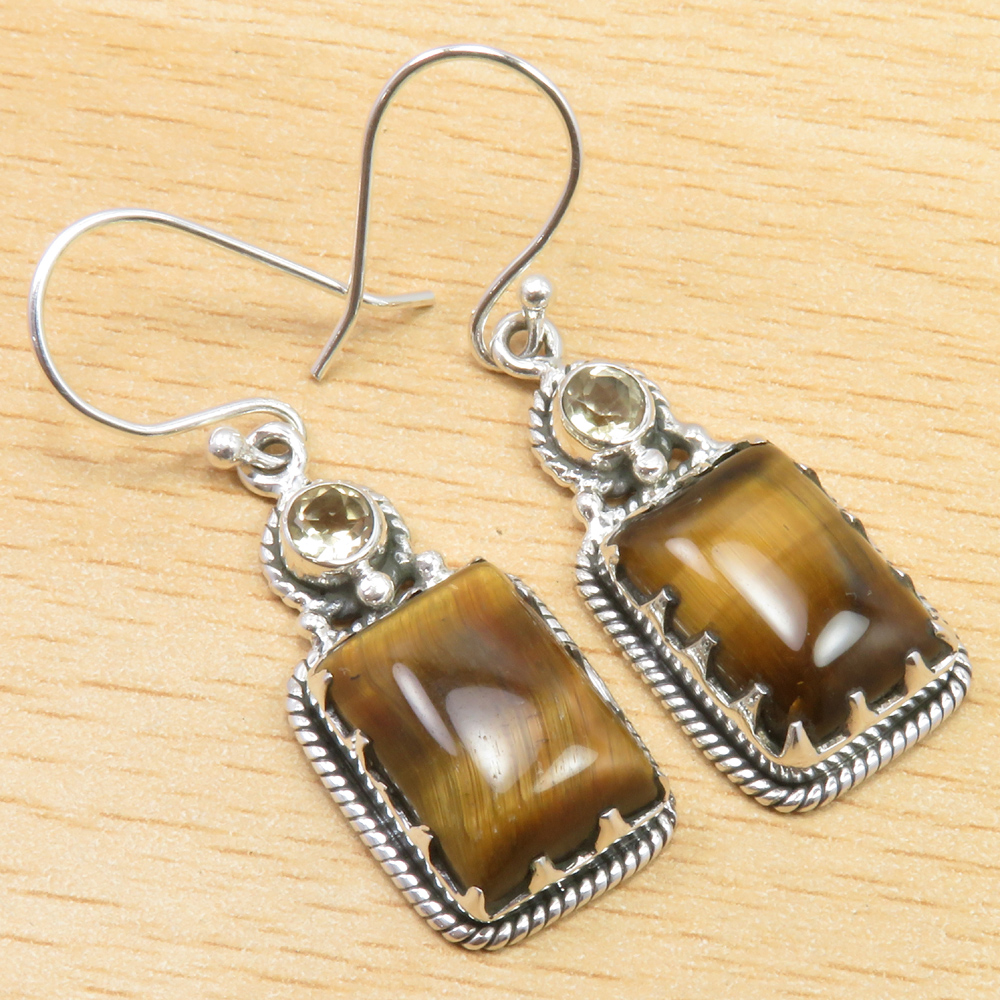 CITRINE & TIGER'S EYE Earrings 1.6" 925 Pure Silver Women's Jewelry Collection