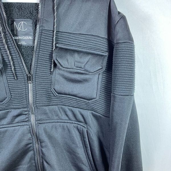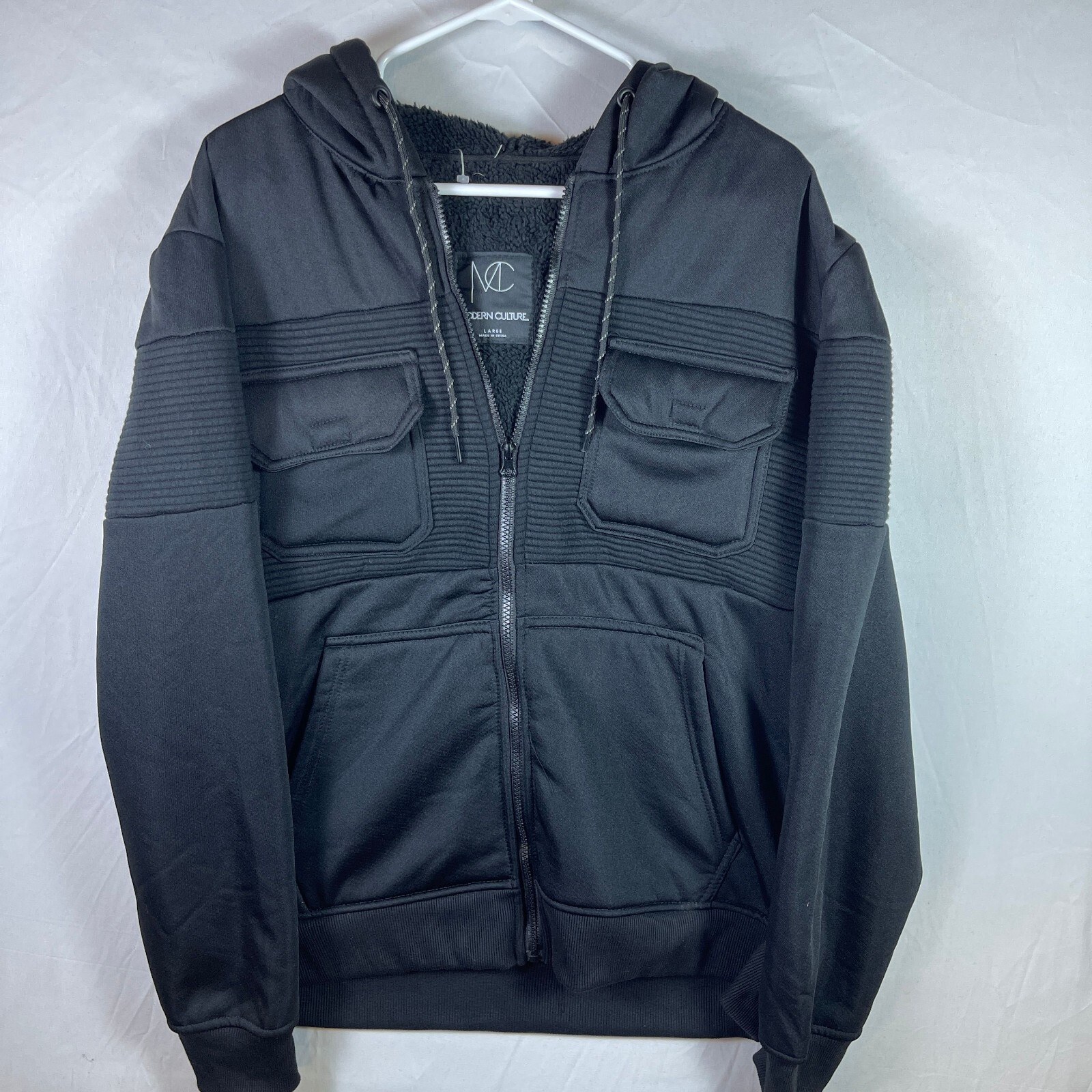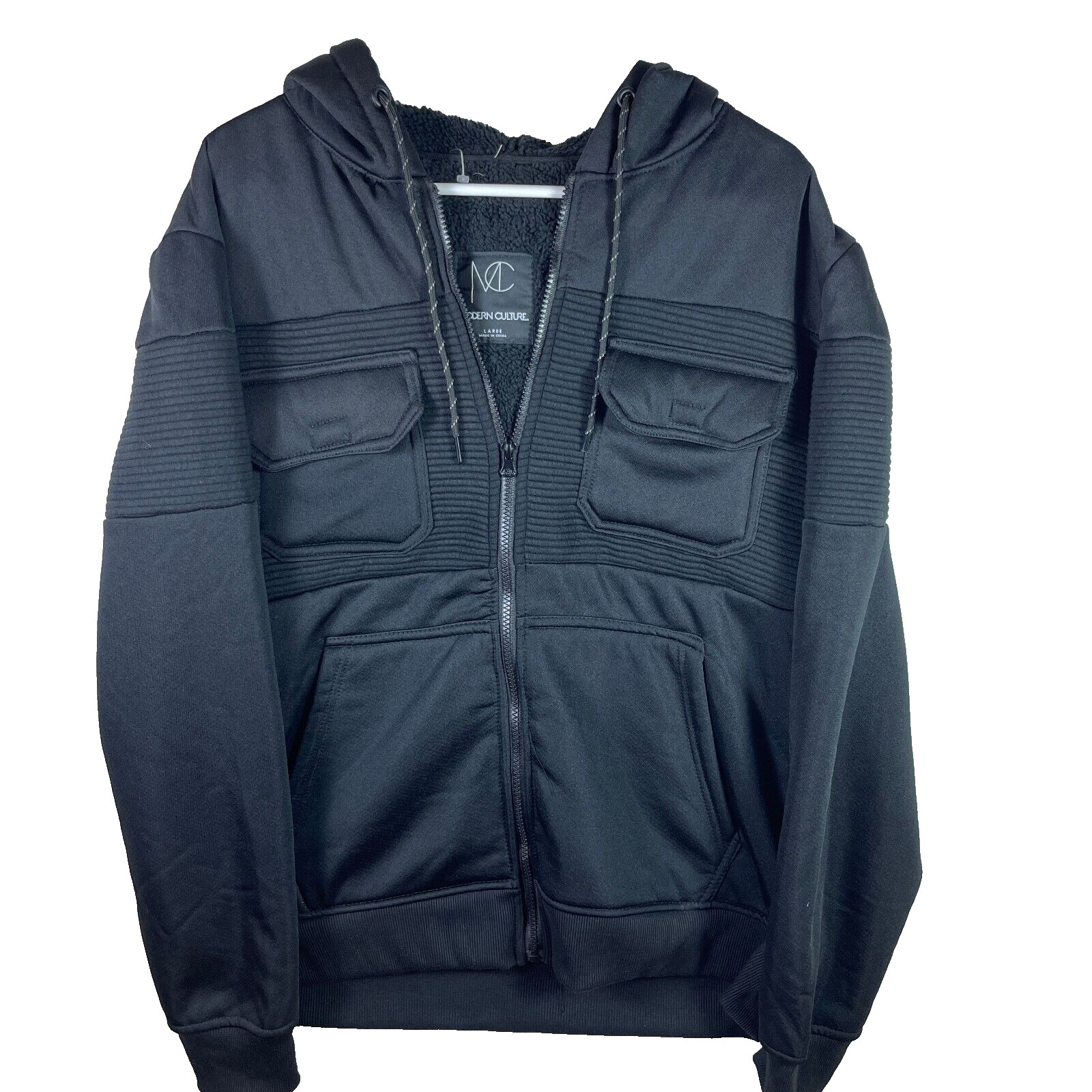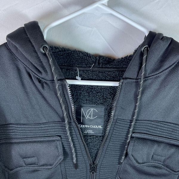 This is a black Sherpa fleece-lined hooded jacket by Modern Culture, designed in a mid-length style with long sleeves and a zip closure.