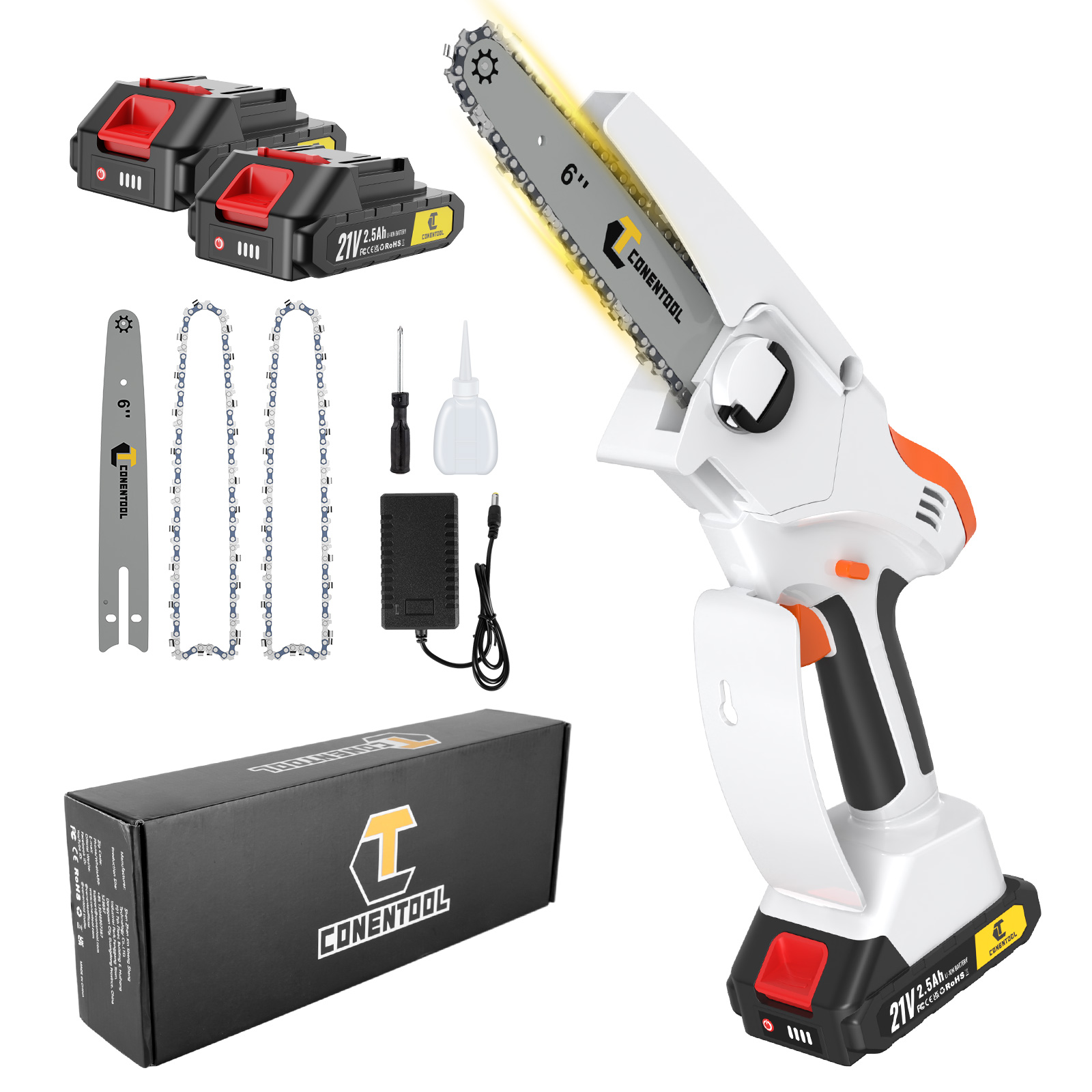 Langlebiger Akku: Angetrieben von einem leistungsstarken, wiederaufladbaren Lithium-Akku, gewährleistet diese Kettensäge eine stabile und zuverlässige Leistung. Nutzen Sie die Akkus abwechselnd, um kontinuierliche Energie für all Ihre Außenprojekte zu gewährleisten.