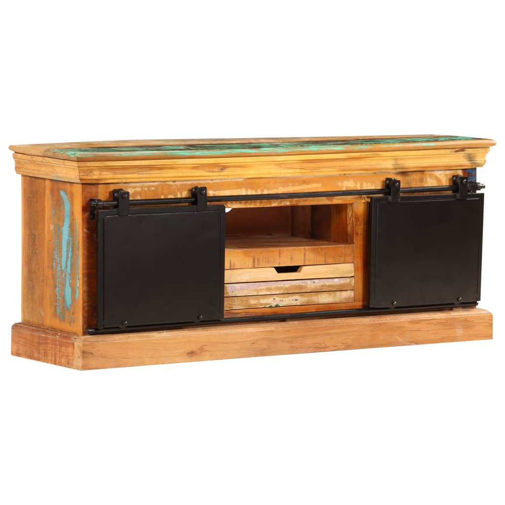 The HiFi cabinet is made of solid reclaimed wood that has been sourced from joists, floors and support beams from old buildings being demolished, and can consist of different types of wood like pine, teak, beech, oak, cedar, mango wood, acacia, etc. This means the reclaimed wood retains the characteristics of these different types of wood. Reclaimed wood is already aged, weathered and dried, so it doesn't shrink or bend. This low board is fully handmade and the beautiful wood grains make every piece of furniture unique and slightly different from each other. The metal doors add the cabinet's industrial style.