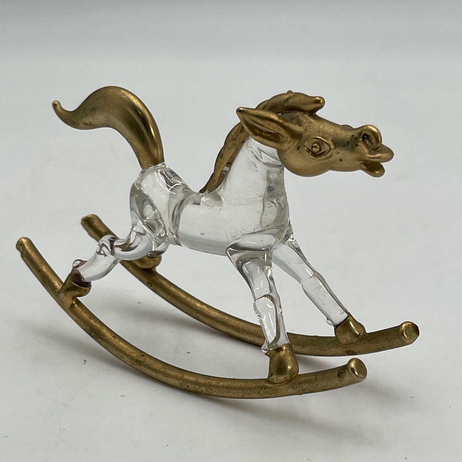 The vintage Crystal & Gold Rocking Horse Small Figurine Decor features a beautiful horse figurine made of crystal and accented with gold details. This elegant piece is perfect for collectors or horse enthusiasts and adds charm to any decor.