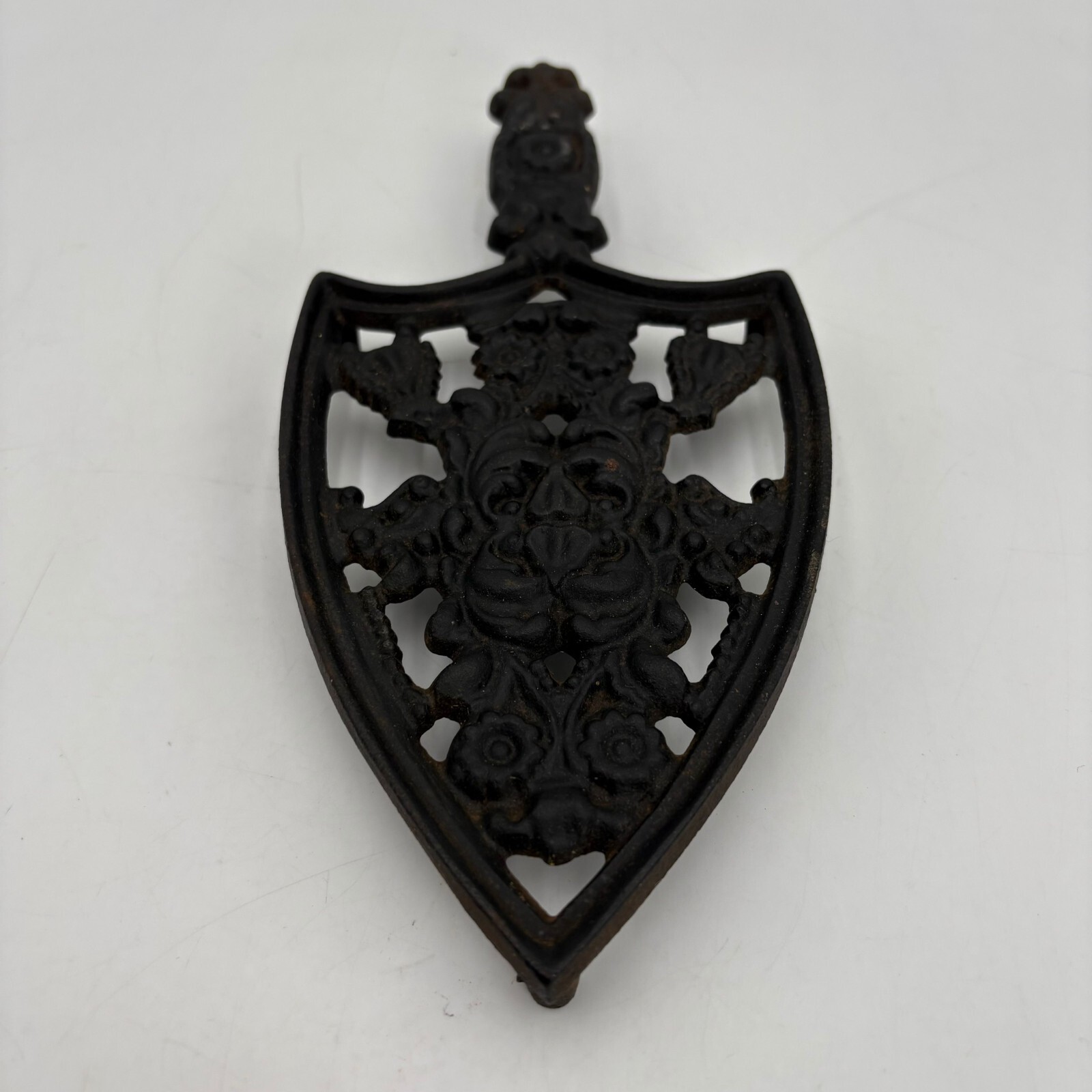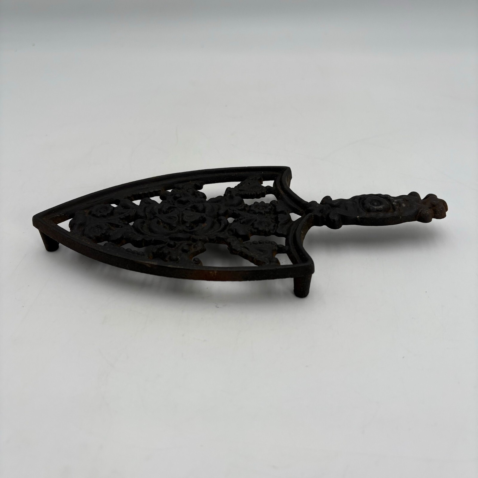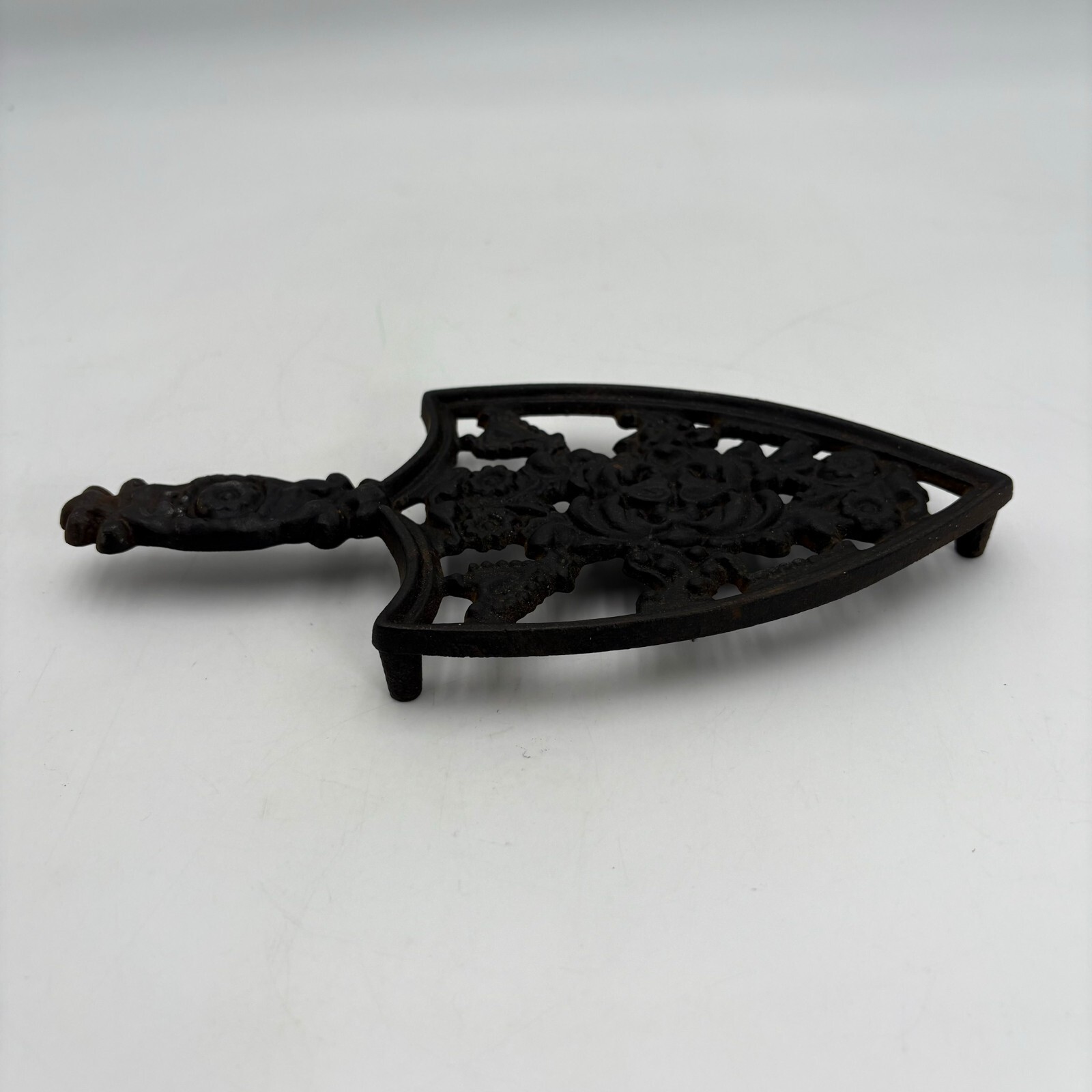 This vintage Wilton trivet is a footed cast iron plate with a heart design, suitable for use as a hot plate for pressing clothes with an iron.