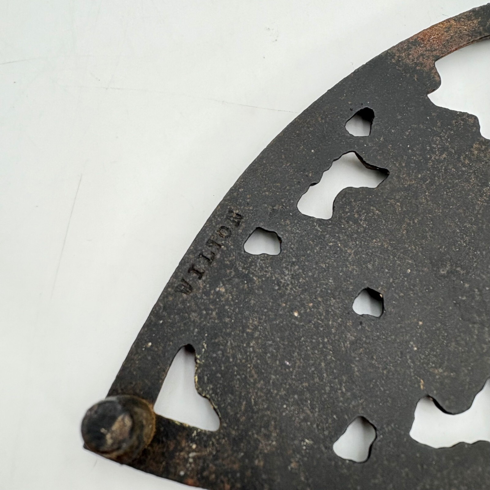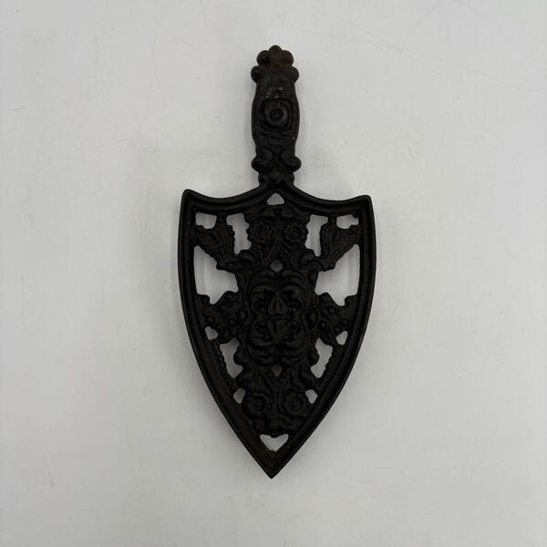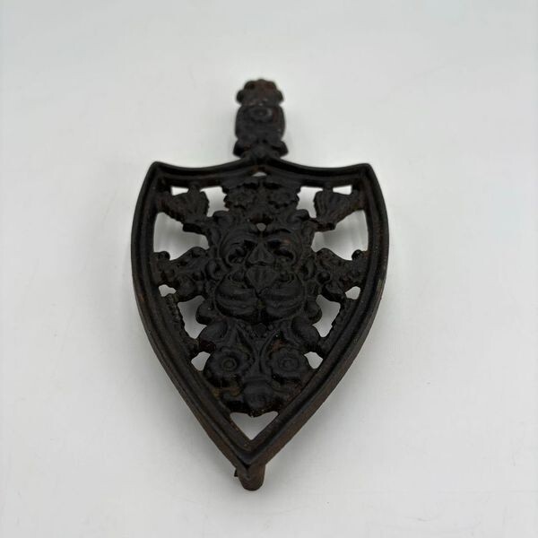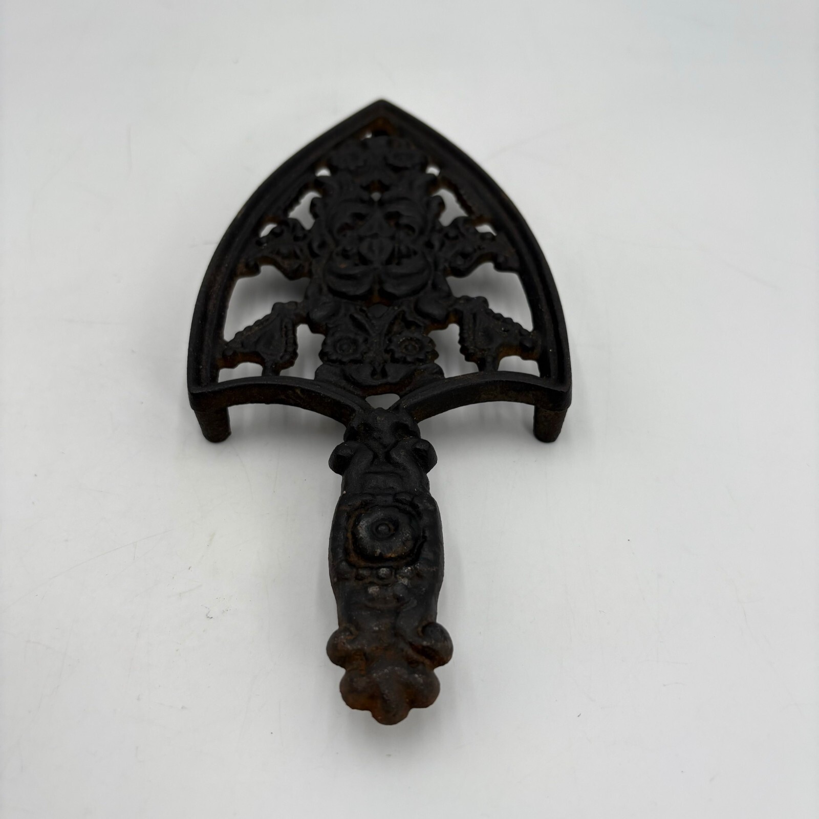 This vintage Wilton trivet is a footed cast iron plate with a heart design, suitable for use as a hot plate for pressing clothes with an iron.